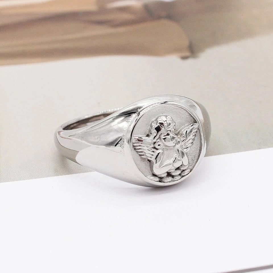 Retro-style angel signet ring made from durable titanium steel. Stylish and unisex, perfect for daily wear or as a gift. Lightweight but sturdy, this ring is a unique statement piece. Never worn. Available sizes: 9, 10 (US). Perfect for casual or streetwear looks.