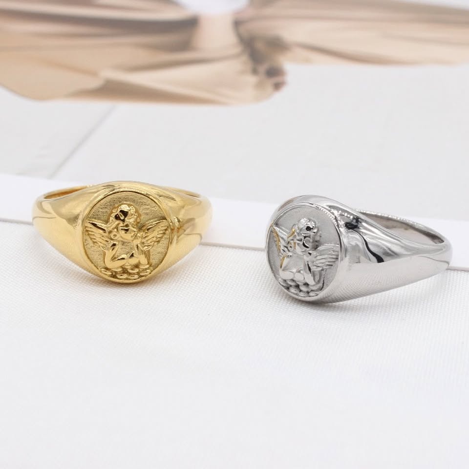 Retro-style angel signet ring made from durable titanium steel. Stylish and unisex, perfect for daily wear or as a gift. Lightweight but sturdy, this ring is a unique statement piece. Never worn. Available sizes: 9, 10 (US). Perfect for casual or streetwear looks.