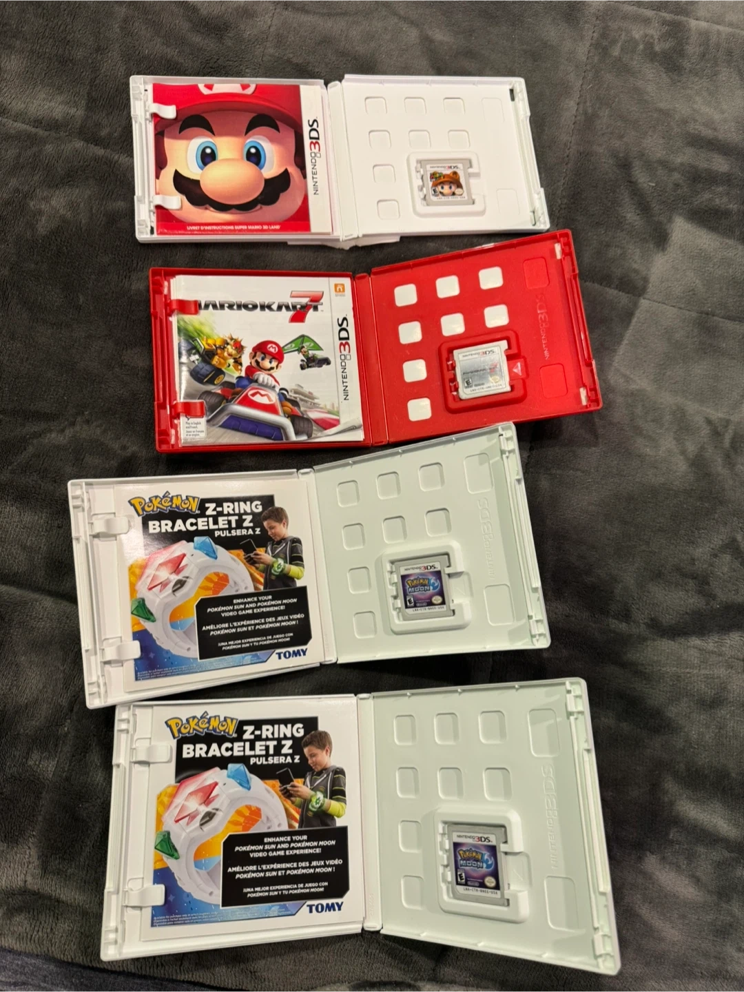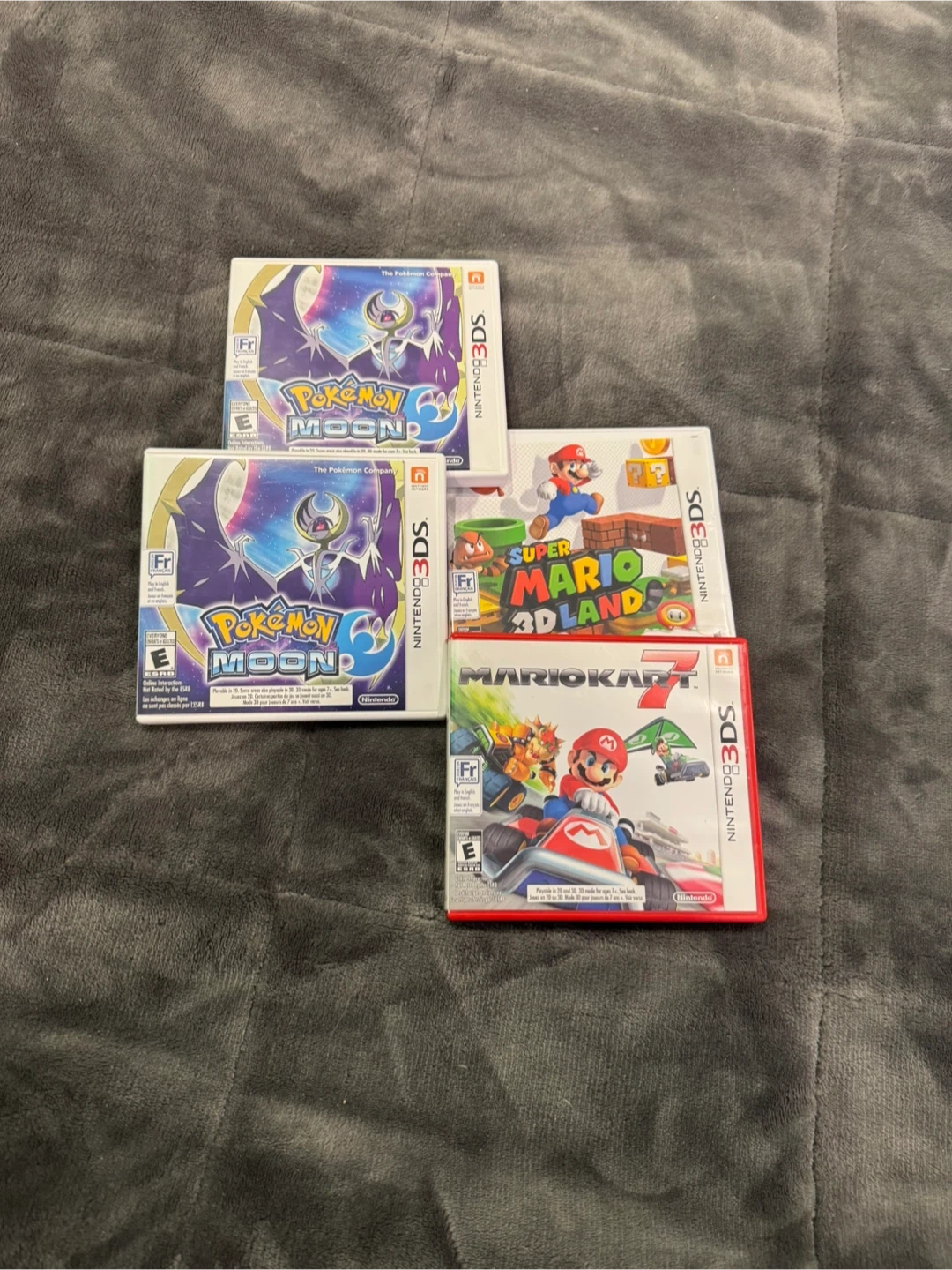 4 Nintendo 3ds games Pokemon moon x2, super mario 3d land , and Mario kart 7
