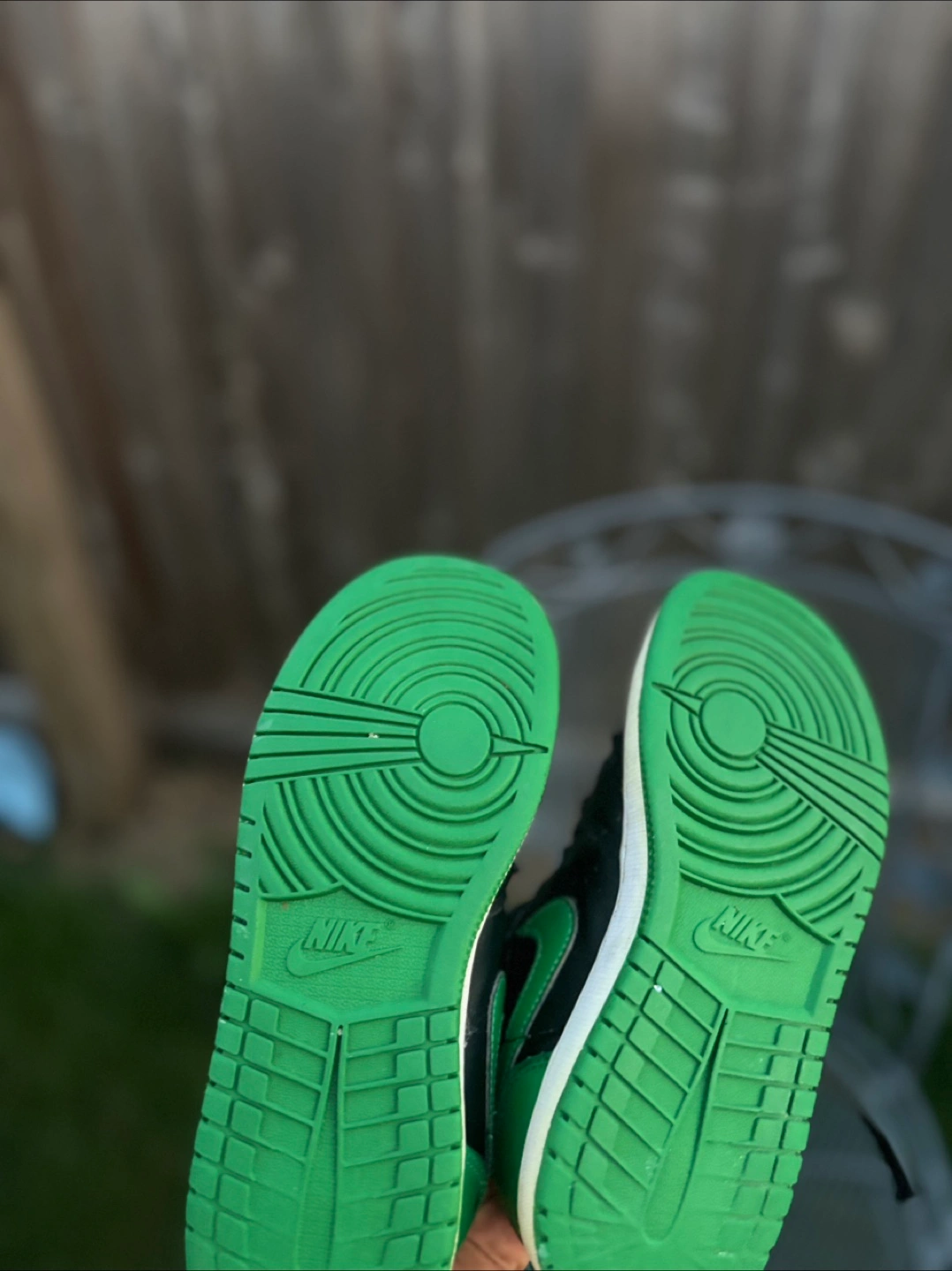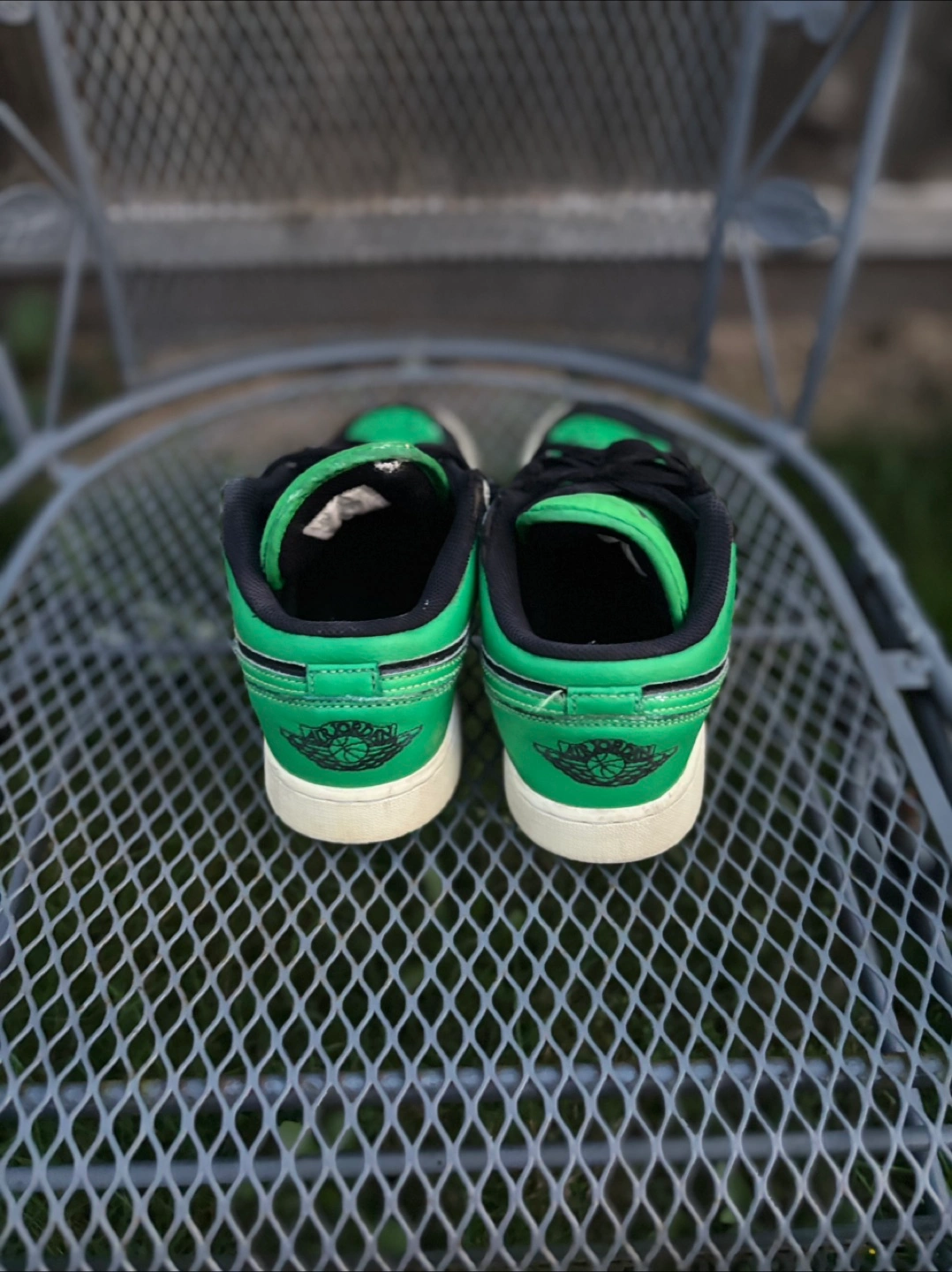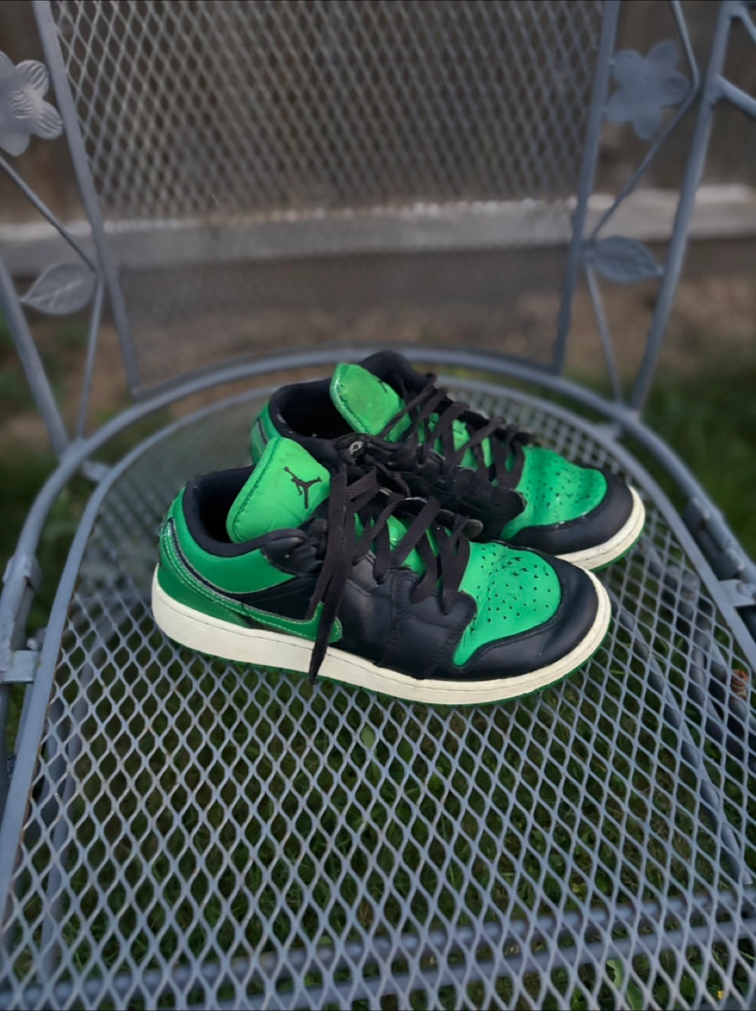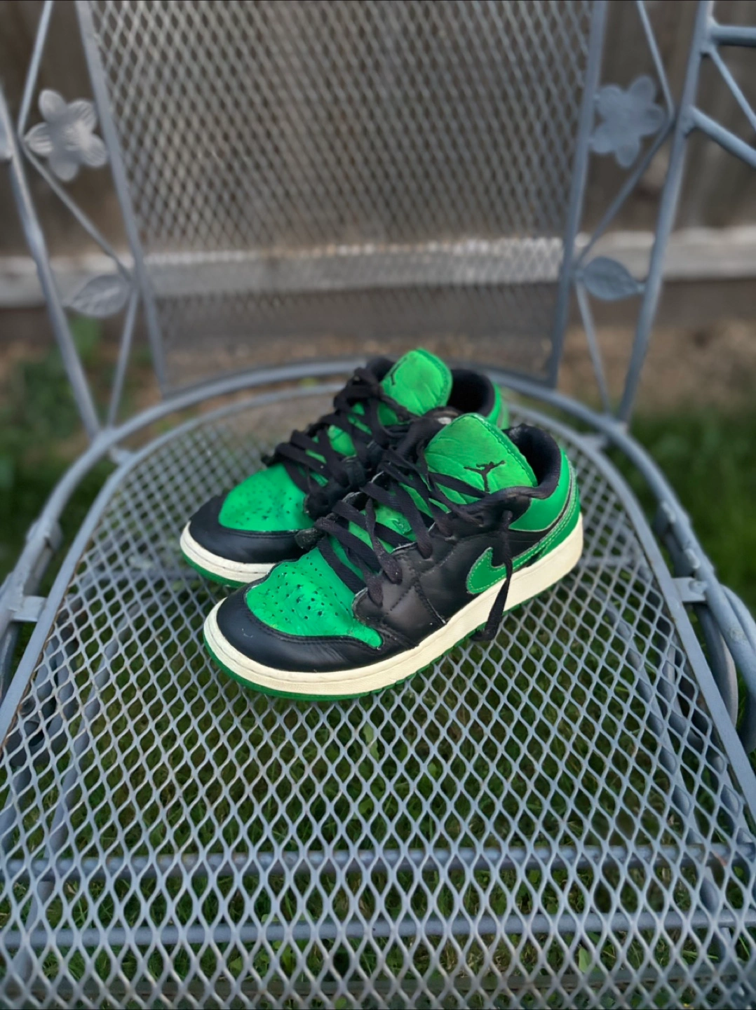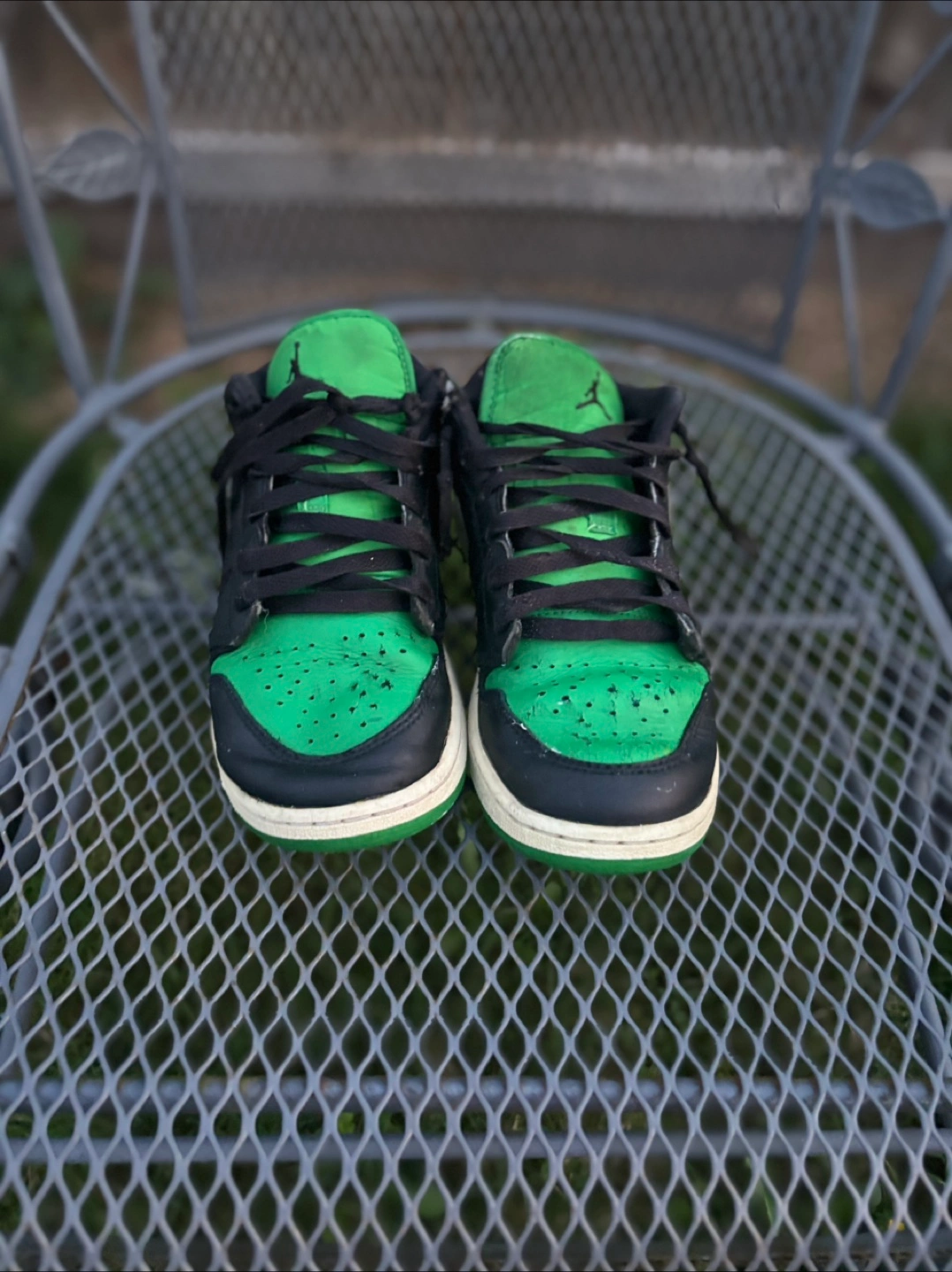 Selling a pair of Jordan 1 Low sneakers in a green and black colourway. They show some signs of wear, but still have lots of life left! Size 5.5 mens