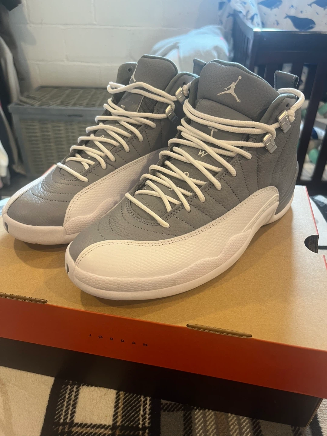 65Selling a pair of Jordan 12 Retro sneakers Cool grey and white. These are a US size 9 men’s and are in great condition. Worn once