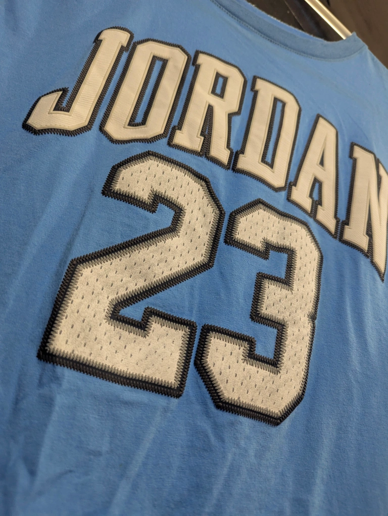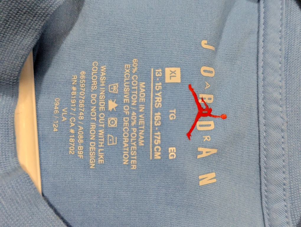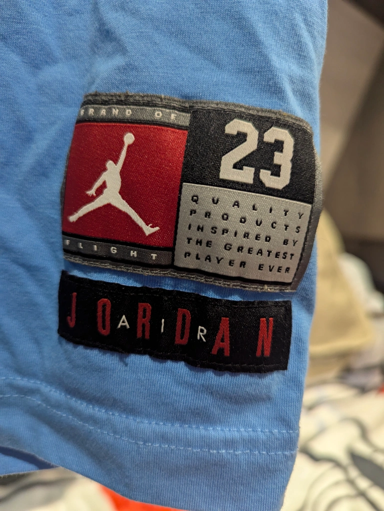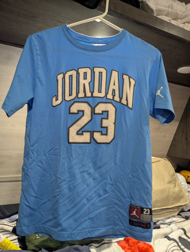 Get your young baller ready with this cool Jordan 23 t-shirt! It's a light blue colour and size XL, which fits kids aged 13-15 years or 163-175 cm. The shirt is made of 60% cotton and 40% polyester This top is brand new just missing tags.