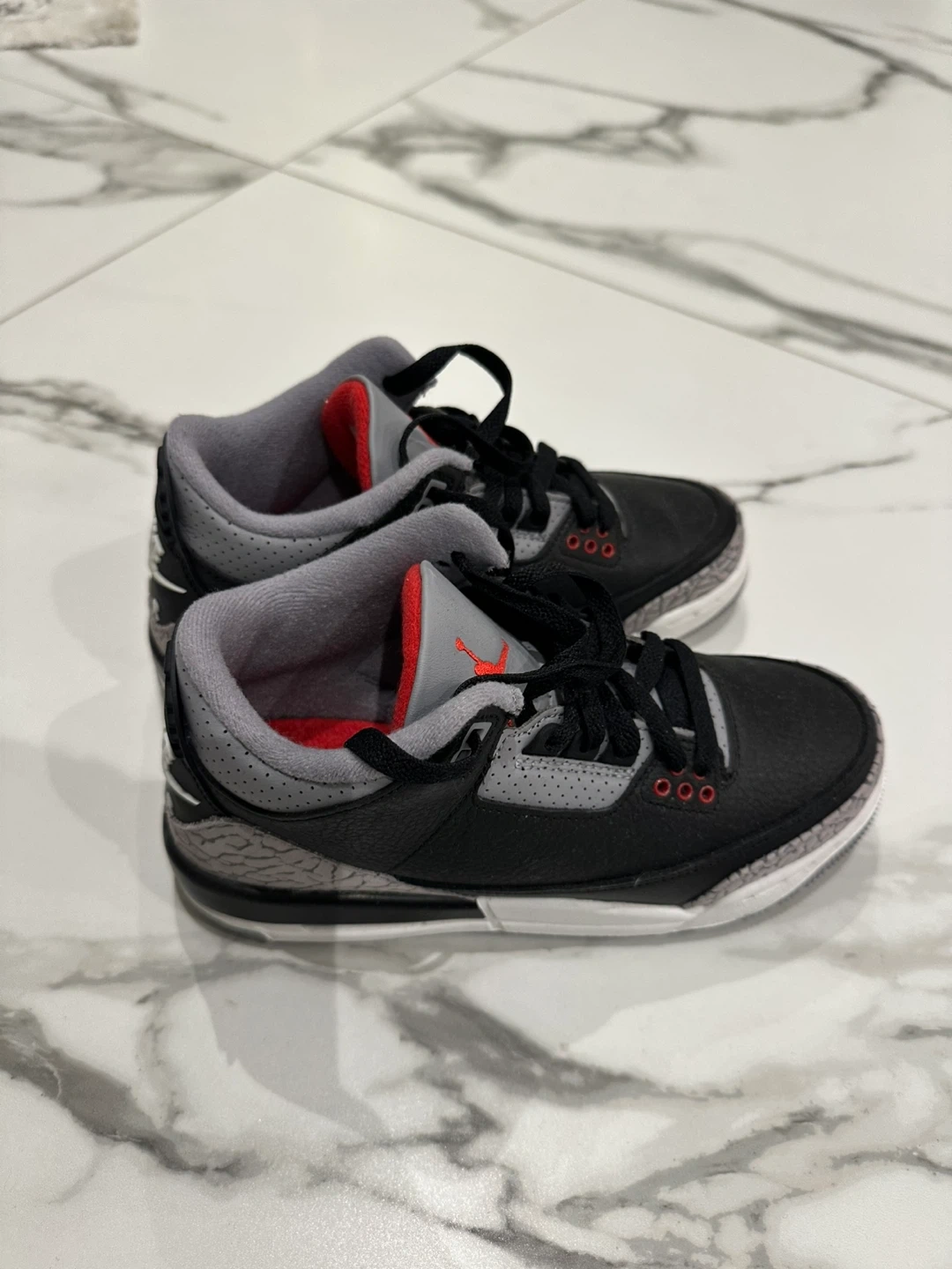 21Selling a pair of Jordan 3 Retro Black Cement sneakers in a kids' size 4.5 junior. They are in great condition!