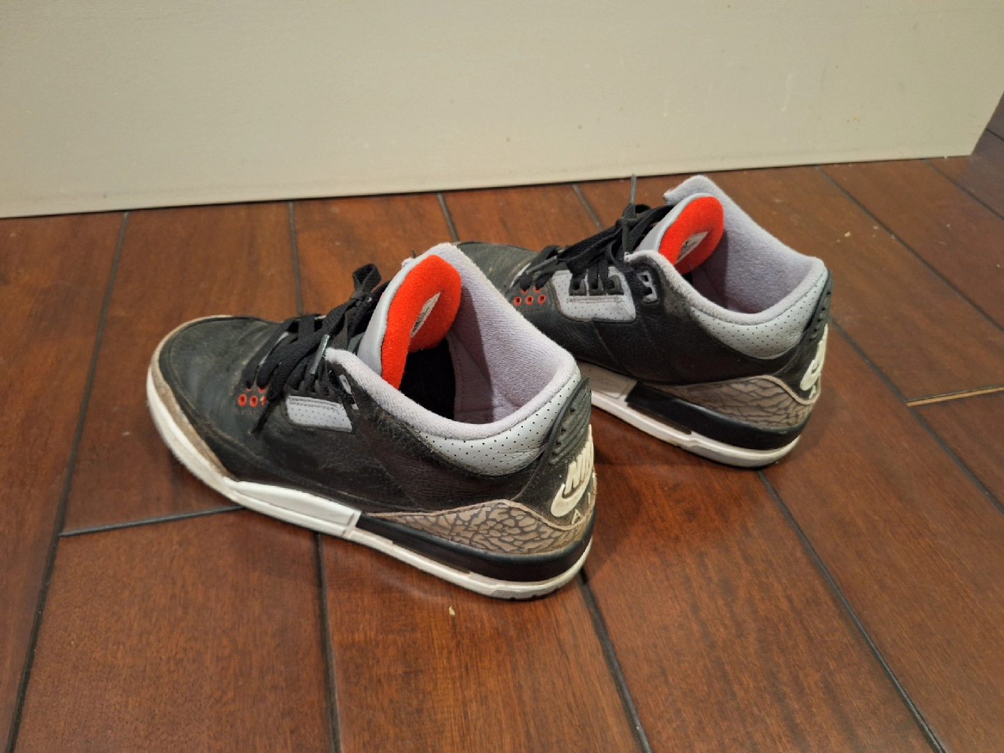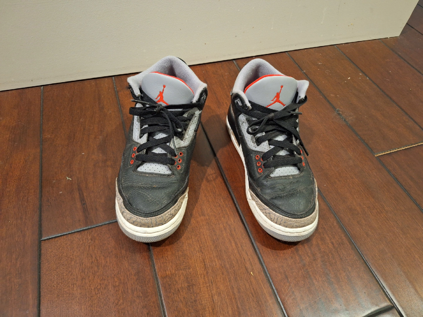 Selling a pair of Jordan 3 Retro shoes in size 6.5Y. They're in used condition, but still have lots of life left! The colourway is black with red accents.