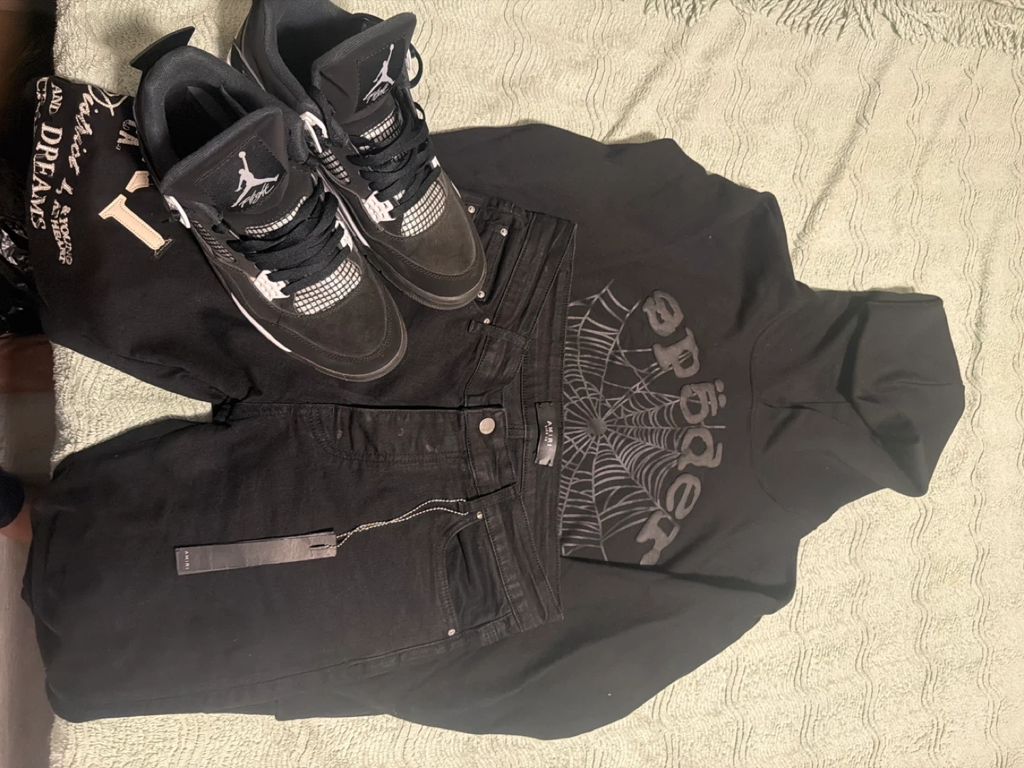Selling a bundle of popular items! Included are a pair of Jordan 4 Retro Black Cat sneakers, Amiri jeans, and a Sp5der hoodie. All items are in great condition and ready for a new home!