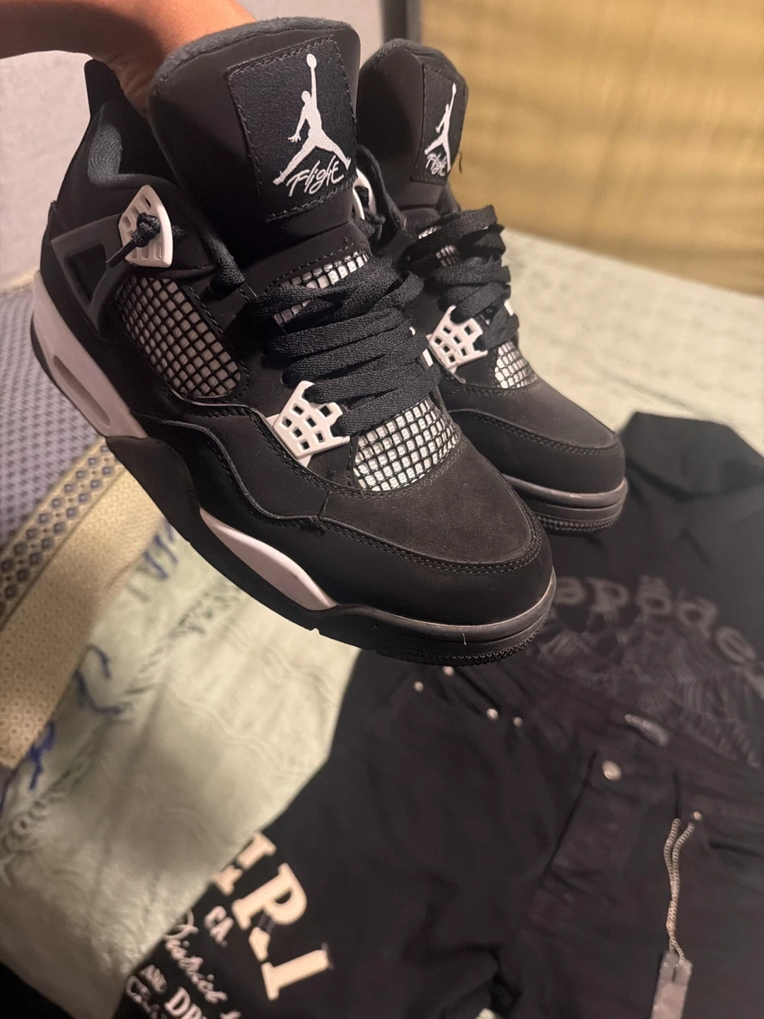 Jordan 4 Retro Black Cat & Amiri Jeans & Sp5der Hoodie