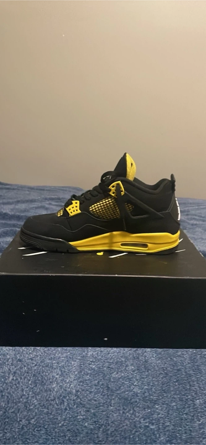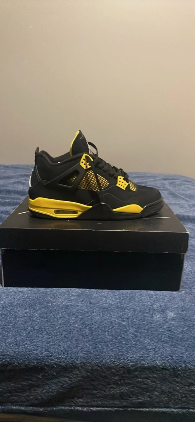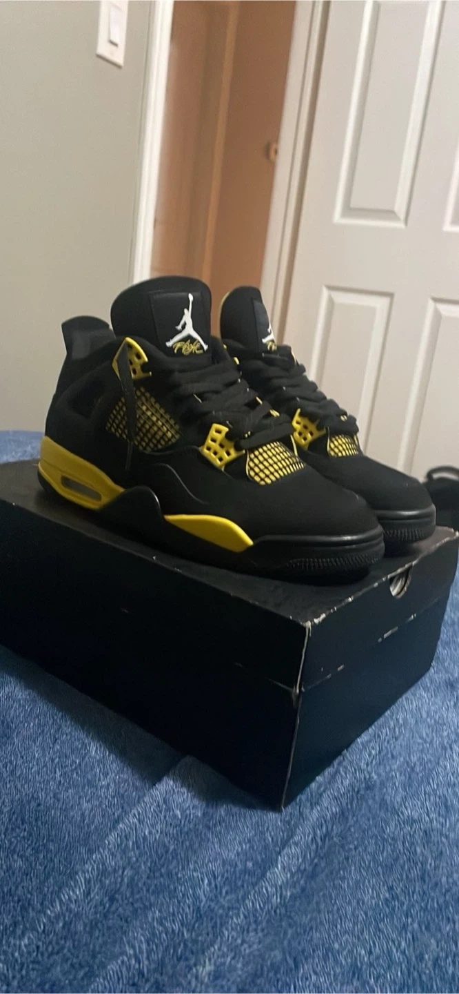10Selling a pair of Jordan 4 Retro Black Lightning sneakers in size 10. They come with the original box and are in great condition! A stylish addition to any sneaker collection