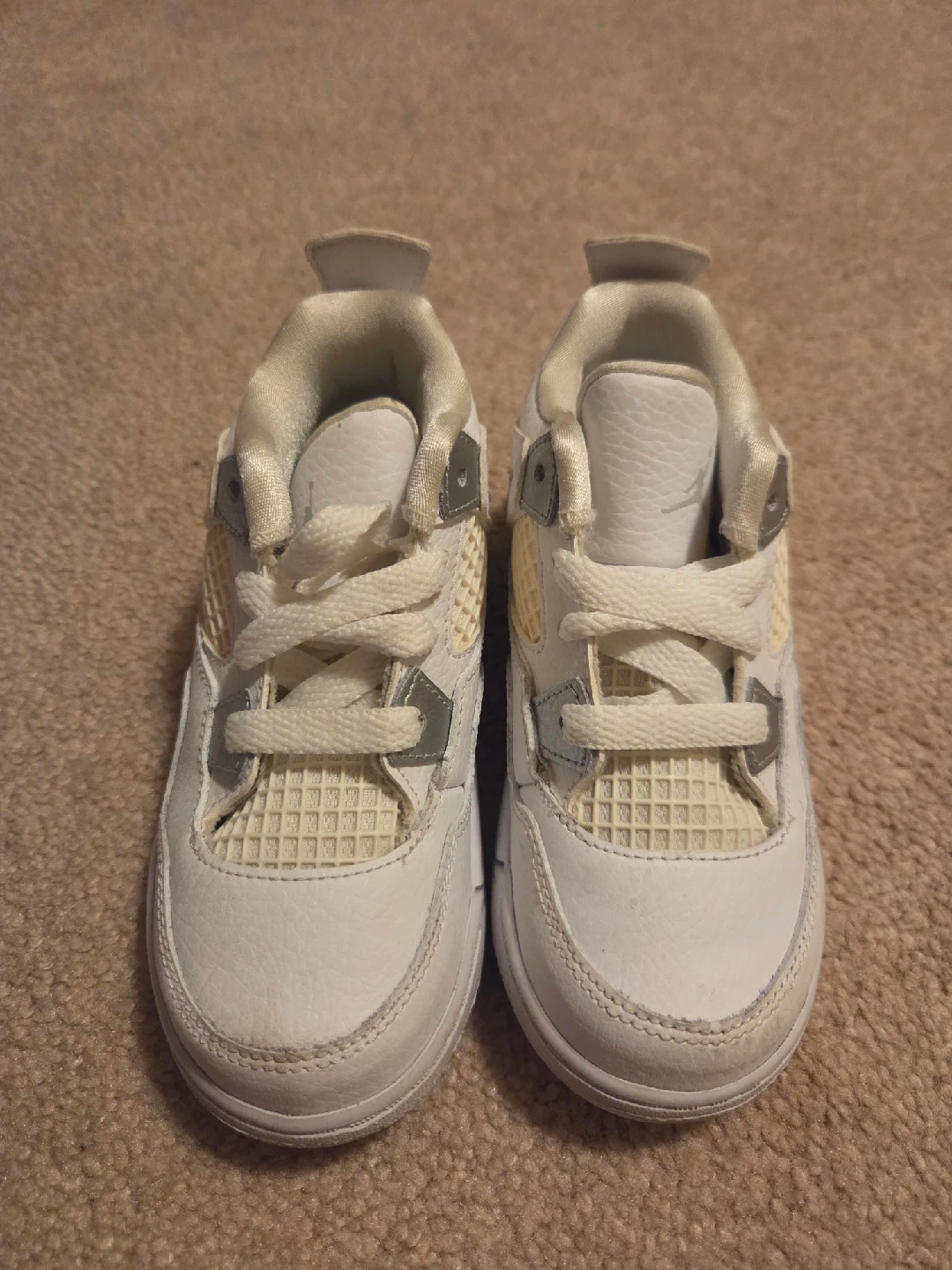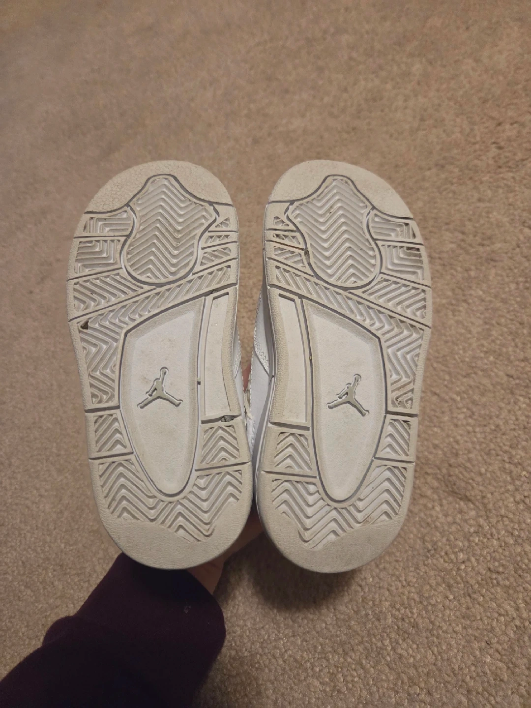 15Selling a pair of Jordan 4 Retro pruemoney toddler shoes in white! They are size 9c and have the classic Jordan logo. Great for your little one! Worn twice