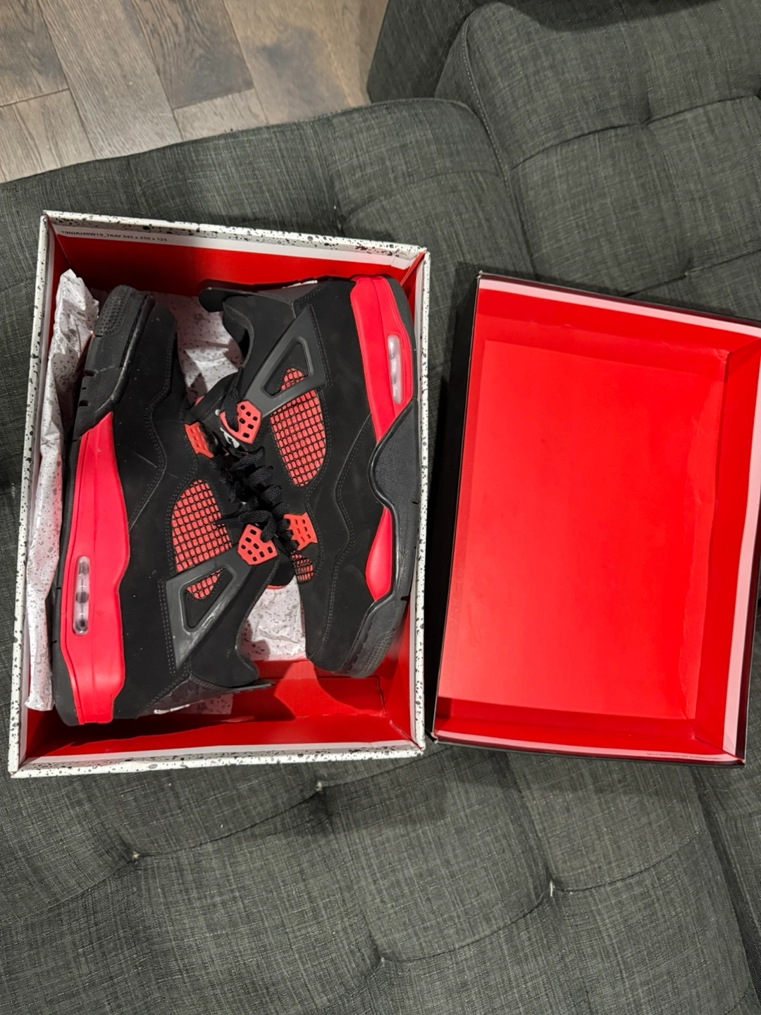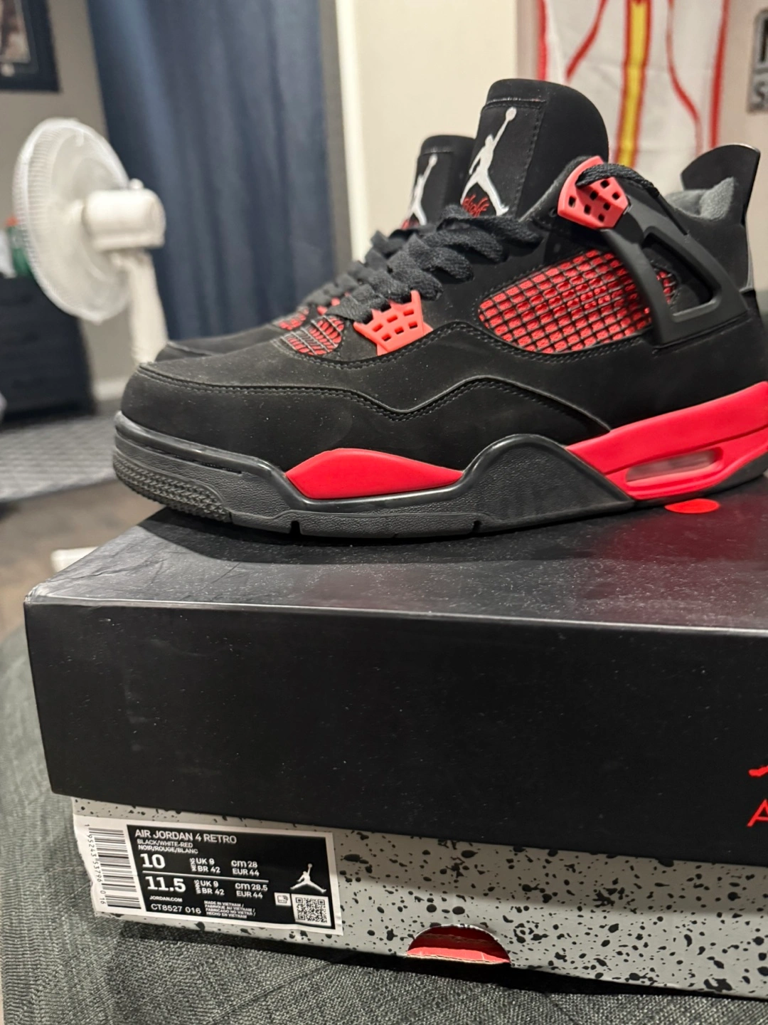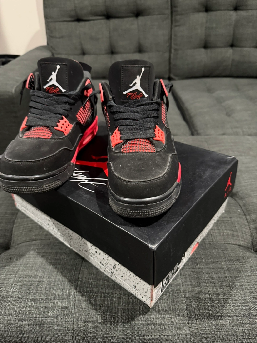 Selling a pair of Air Jordan 4 Retro sneakers in size 10. They come with the original box! The shoes are black with red accents, a classic colourway for this iconic model Firm on price ‼️