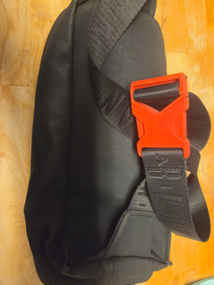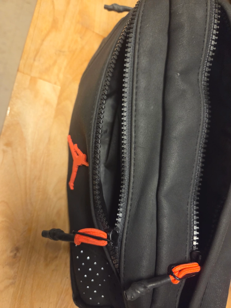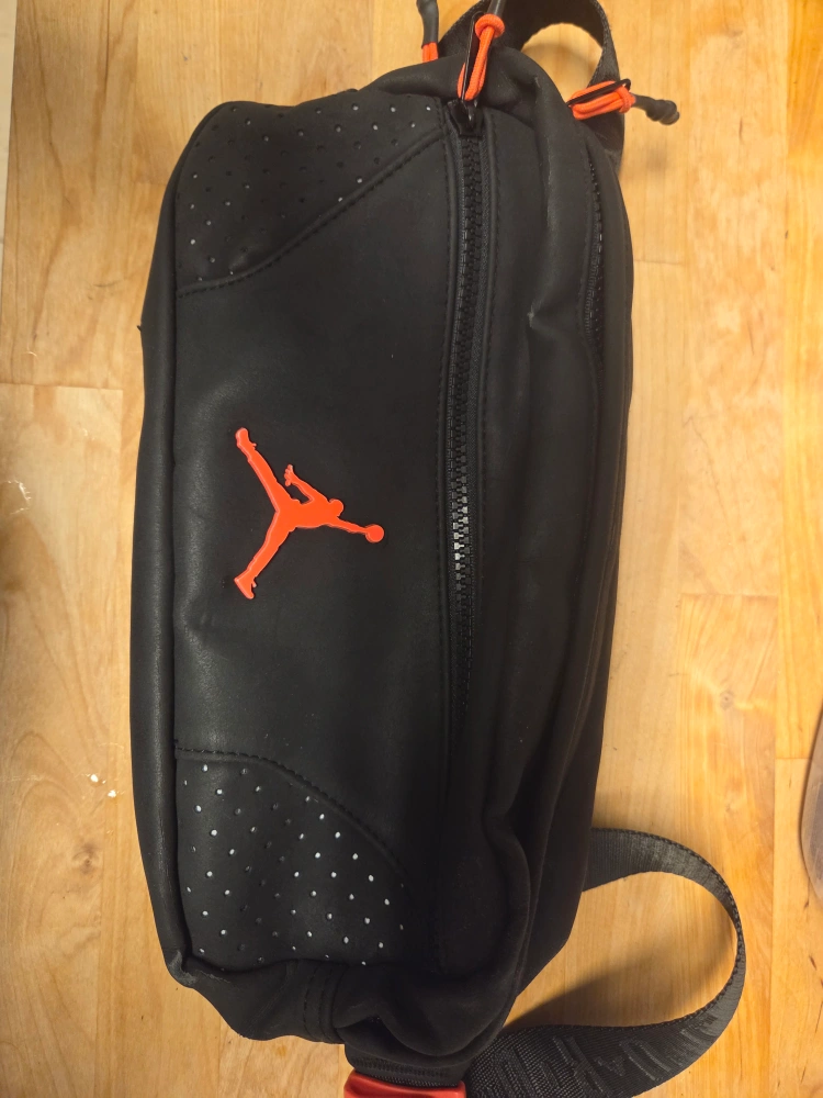 365Selling a Jordan sling bag in black with a red logo. It has a few zippers and compartments for storage. The strap is adjustable with a red buckle.