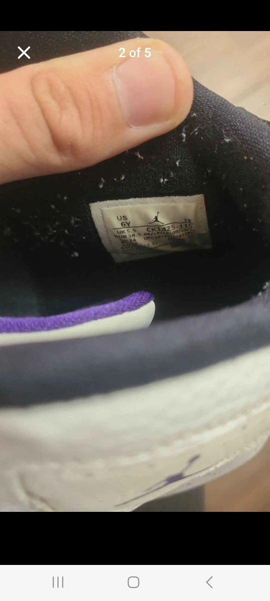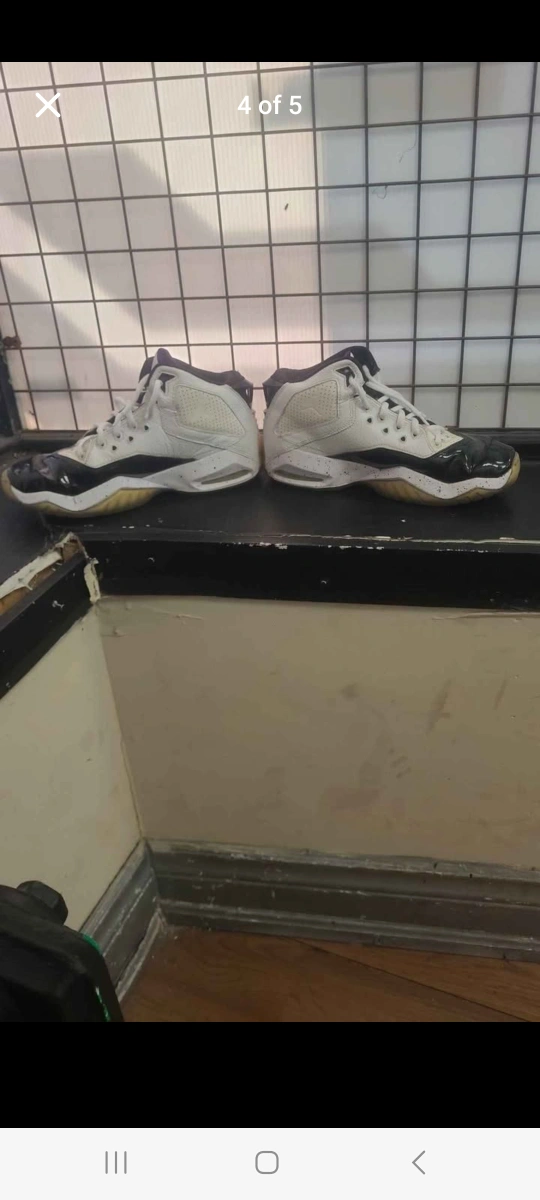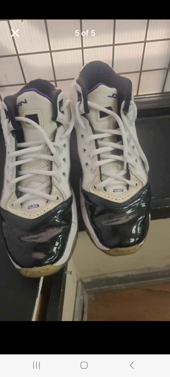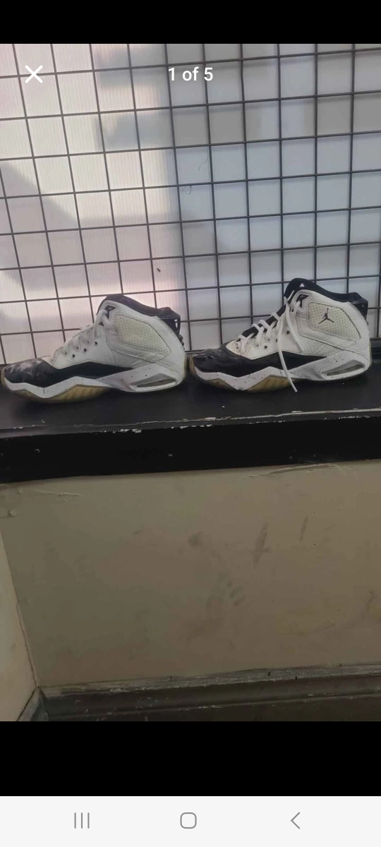 Selling a pair of boys' Jordan basketball shoes in size 6Y. They are white with black accents and the classic Jordan logo. Great for the court or casual wear!