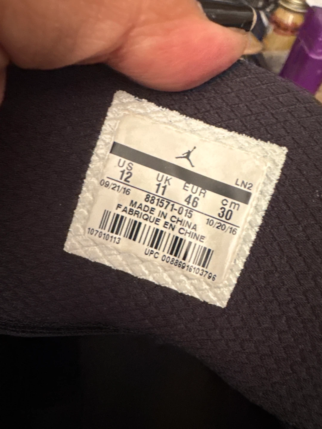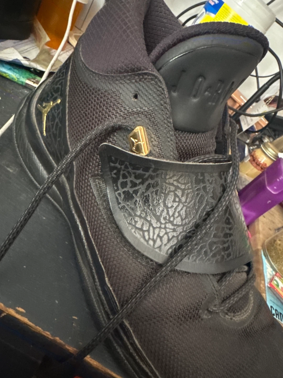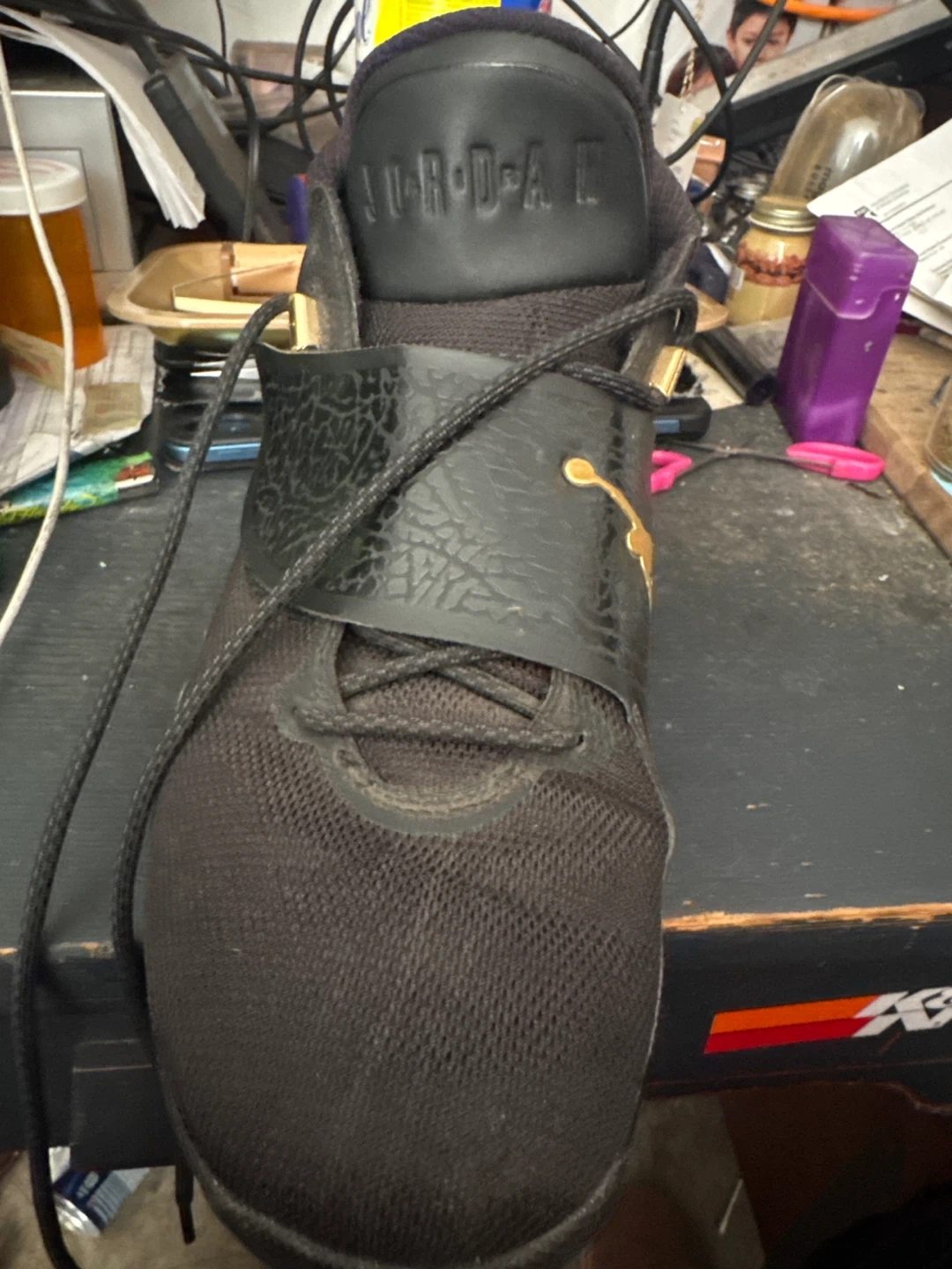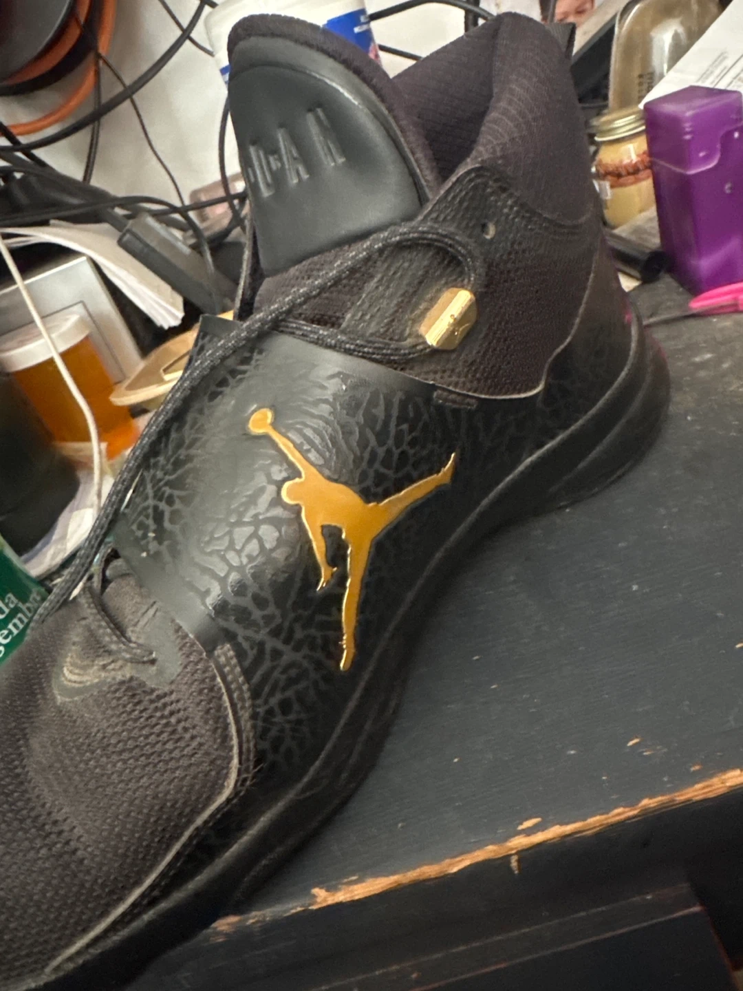 Selling a pair of Jordan high top sneakers in US size 12. They are in used condition but still have lots of life left! The shoes are black with a gold Jordan logo. Only wore it twice.