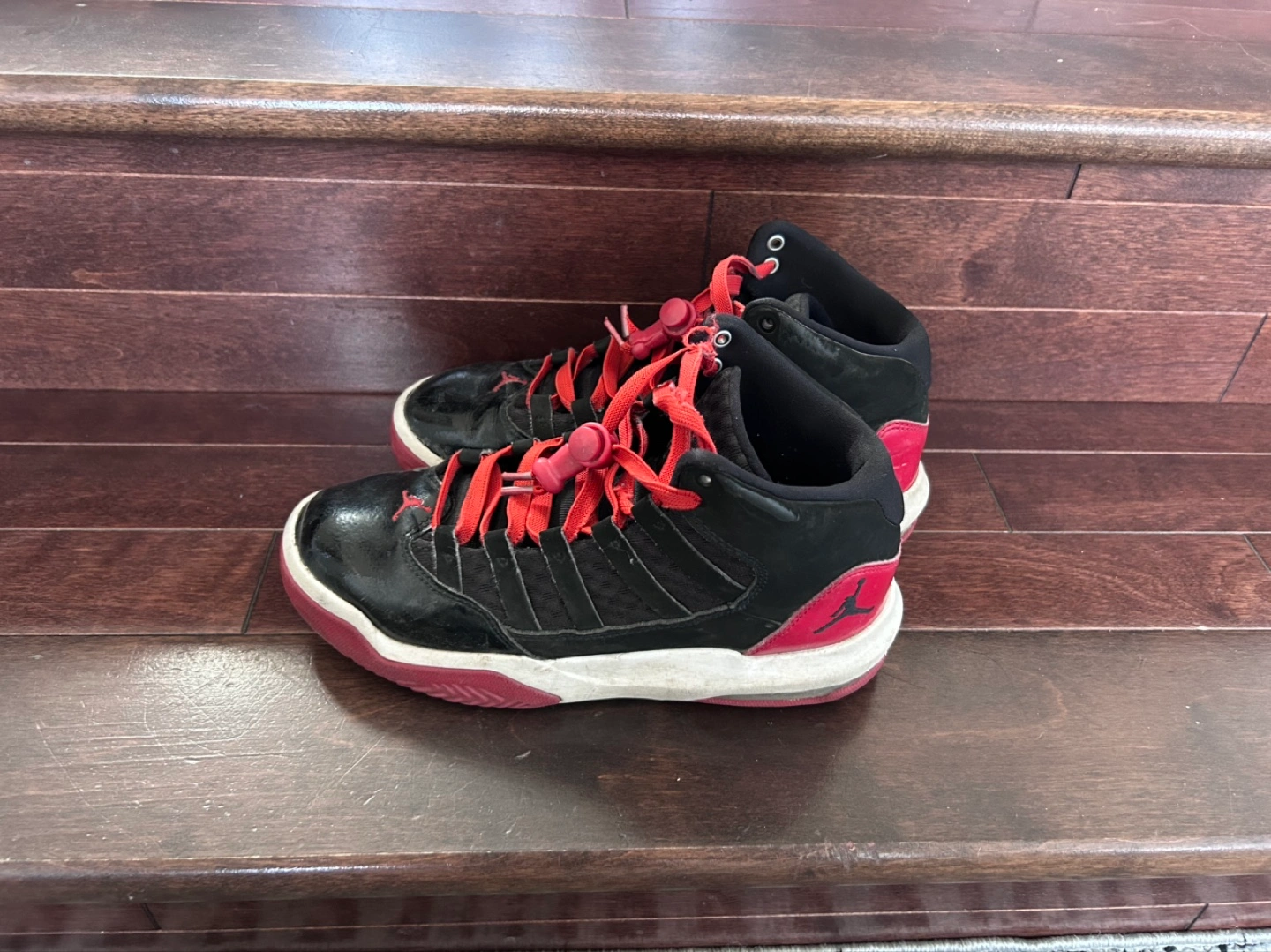 30Pre-owned Jordan basketball shoes for kids. Black and red colour scheme. Mid-top style. Shows some wear.