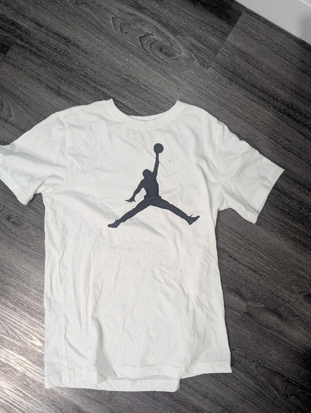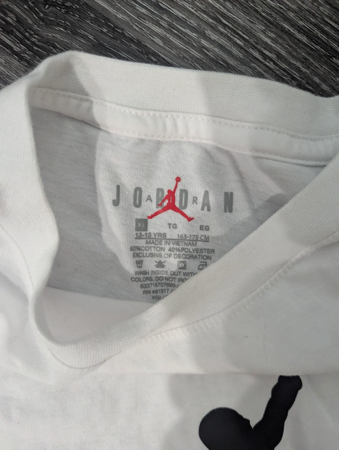 Selling a Jordan t-shirt in excellent condition! The shirt is white with the iconic Jordan logo in black. It's a size XL, recommended for ages 13-15 years. Made of 60% cotton and 40% polyester, so it's comfy and easy to care for