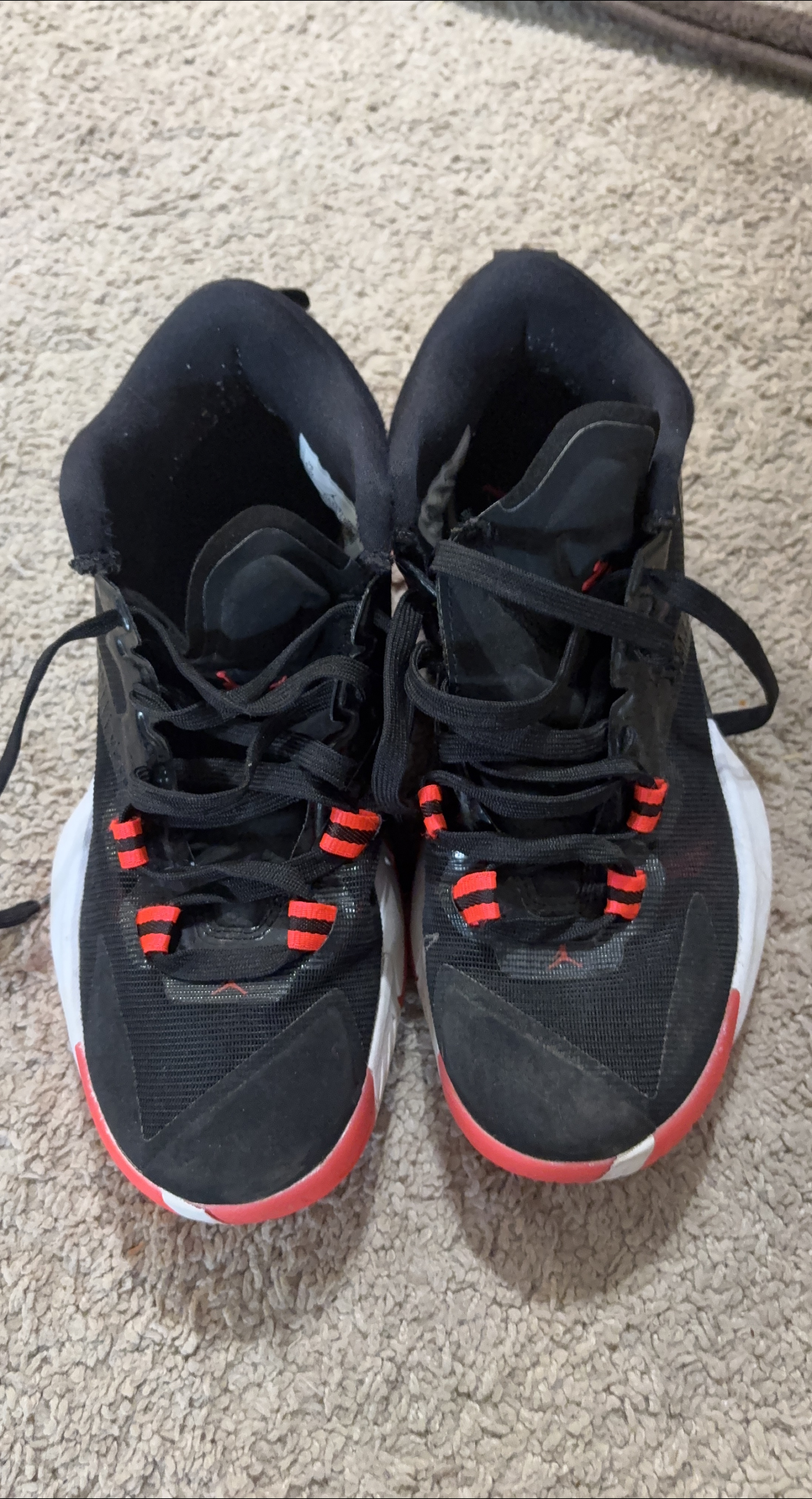 25Selling a pair of Jordan Zoom Separate basketball shoes. They're black with red accents and a white sole. Great for playing ball or just looking stylish!
