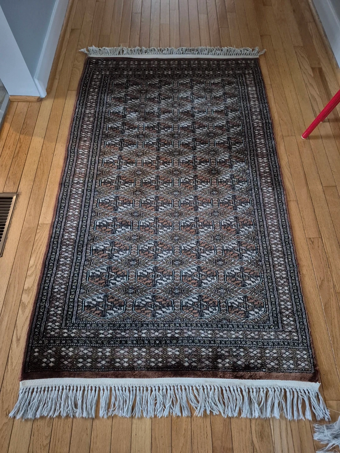 A lovely authentic Bokhara (Bukhara) in the classic pattern called "Elephant Foot". Handmade, 120 knots per square inch, wool.