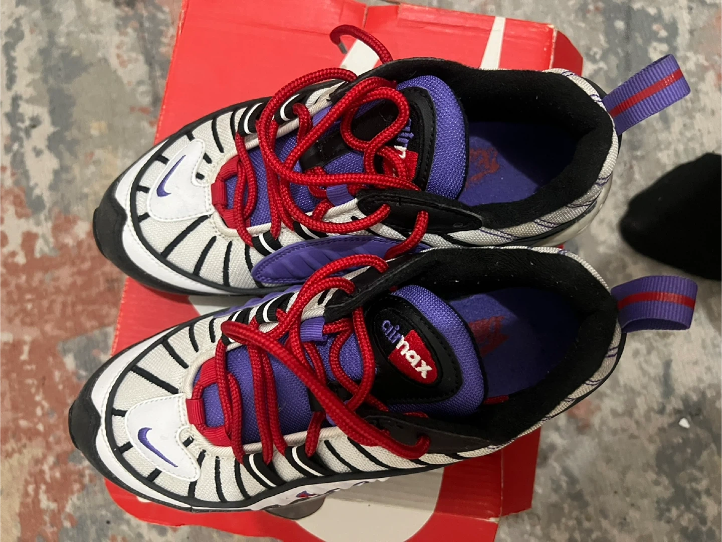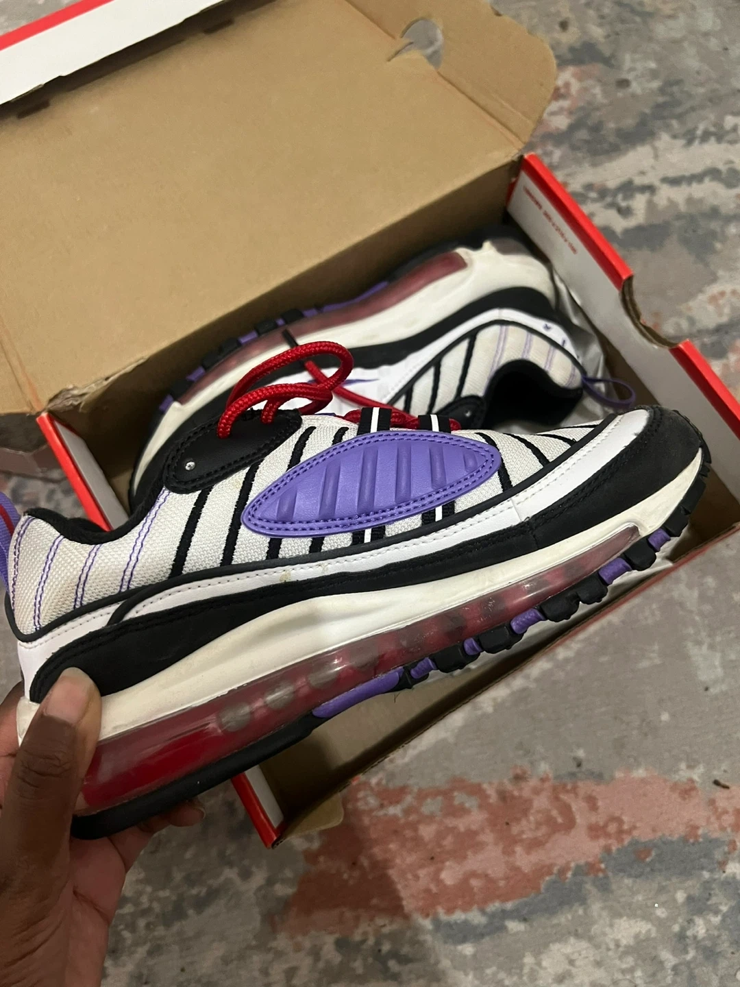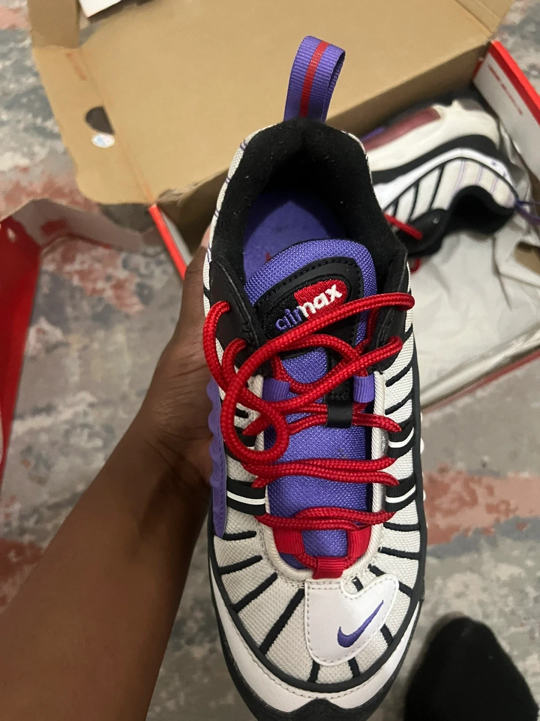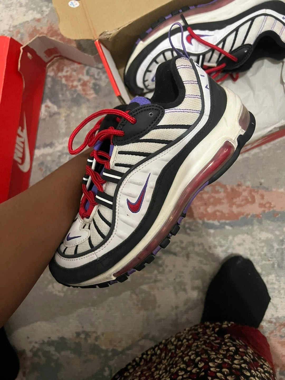 Selling a pair of Nike Air Max 98 sneakers! They feature a cool white, black, and purple colour scheme with red laces (raptors edition) The box is included!