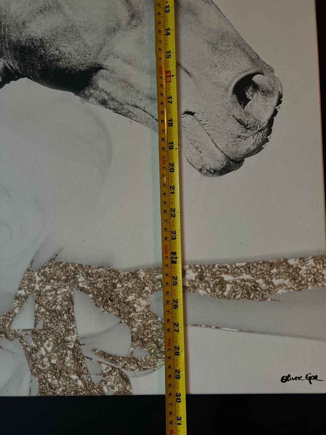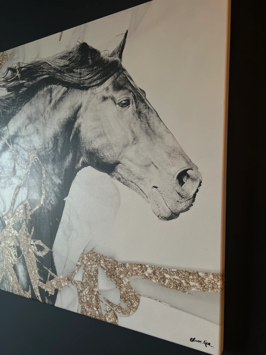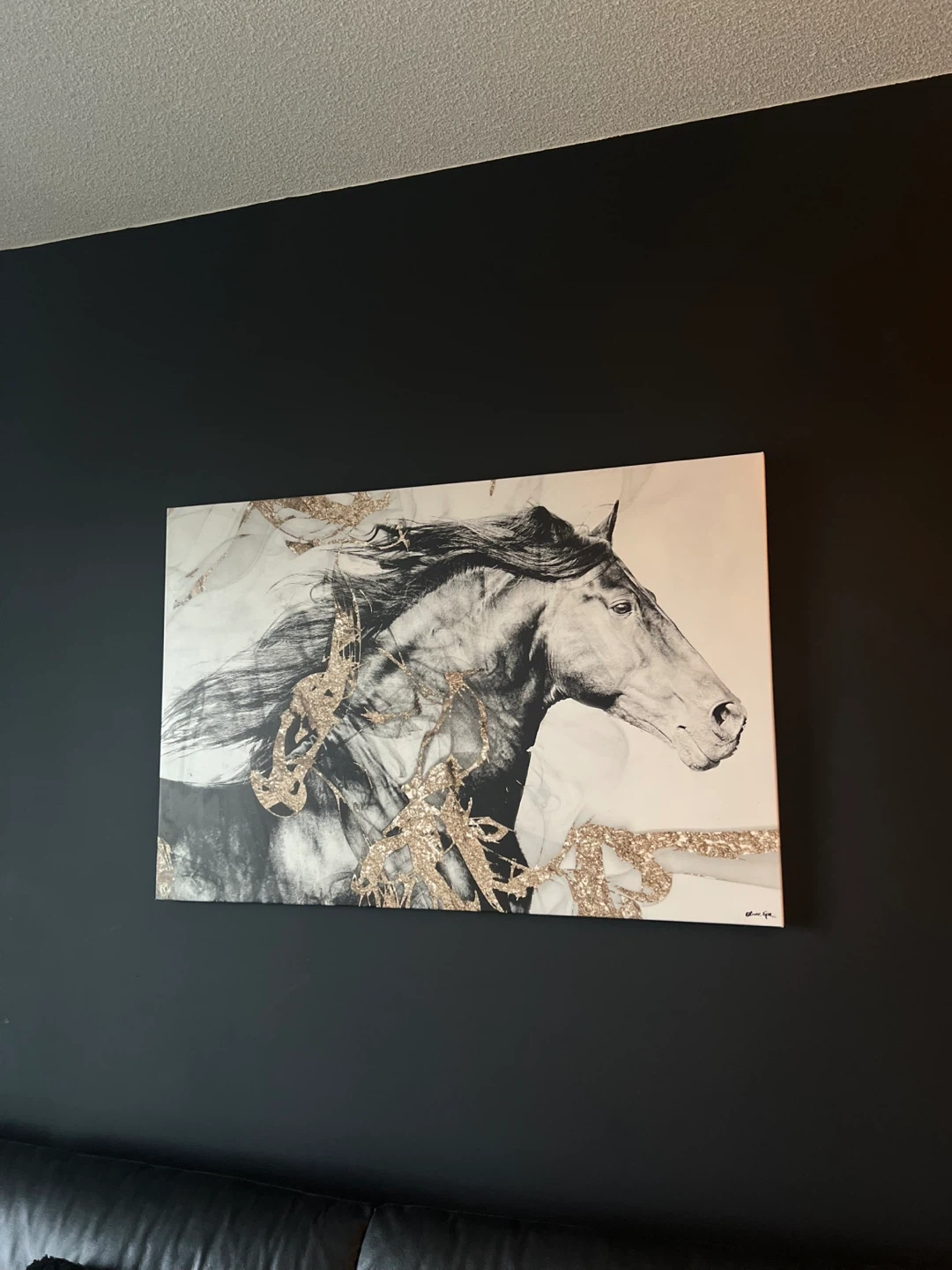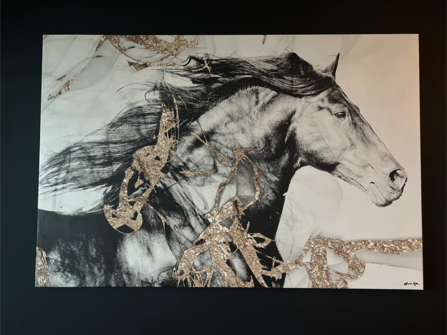 This is a canvas print featuring a black and white image of a horse with gold glitter accents. It's a striking piece of decor. Measurements are approximately 30 inches tall by 45 inches wide. It's ready to hang on your wall!