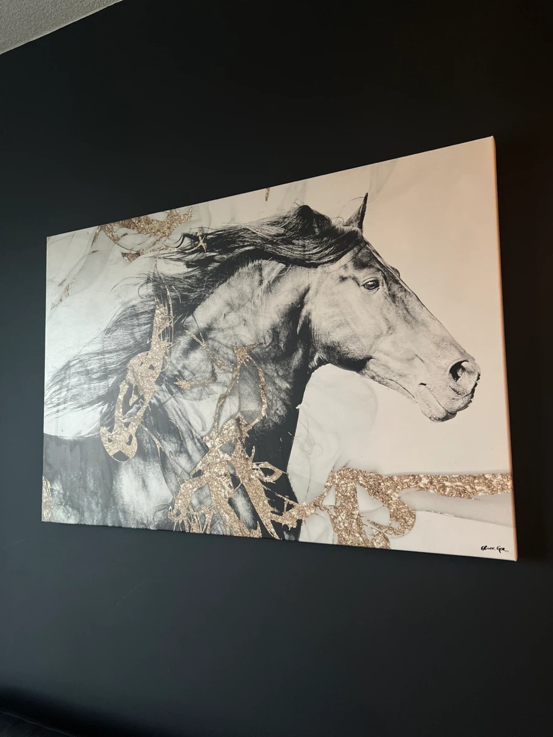 This is a canvas print featuring a black and white image of a horse with gold glitter accents. It's a striking piece of decor. Measurements are approximately 30 inches tall by 45 inches wide. It's ready to hang on your wall!