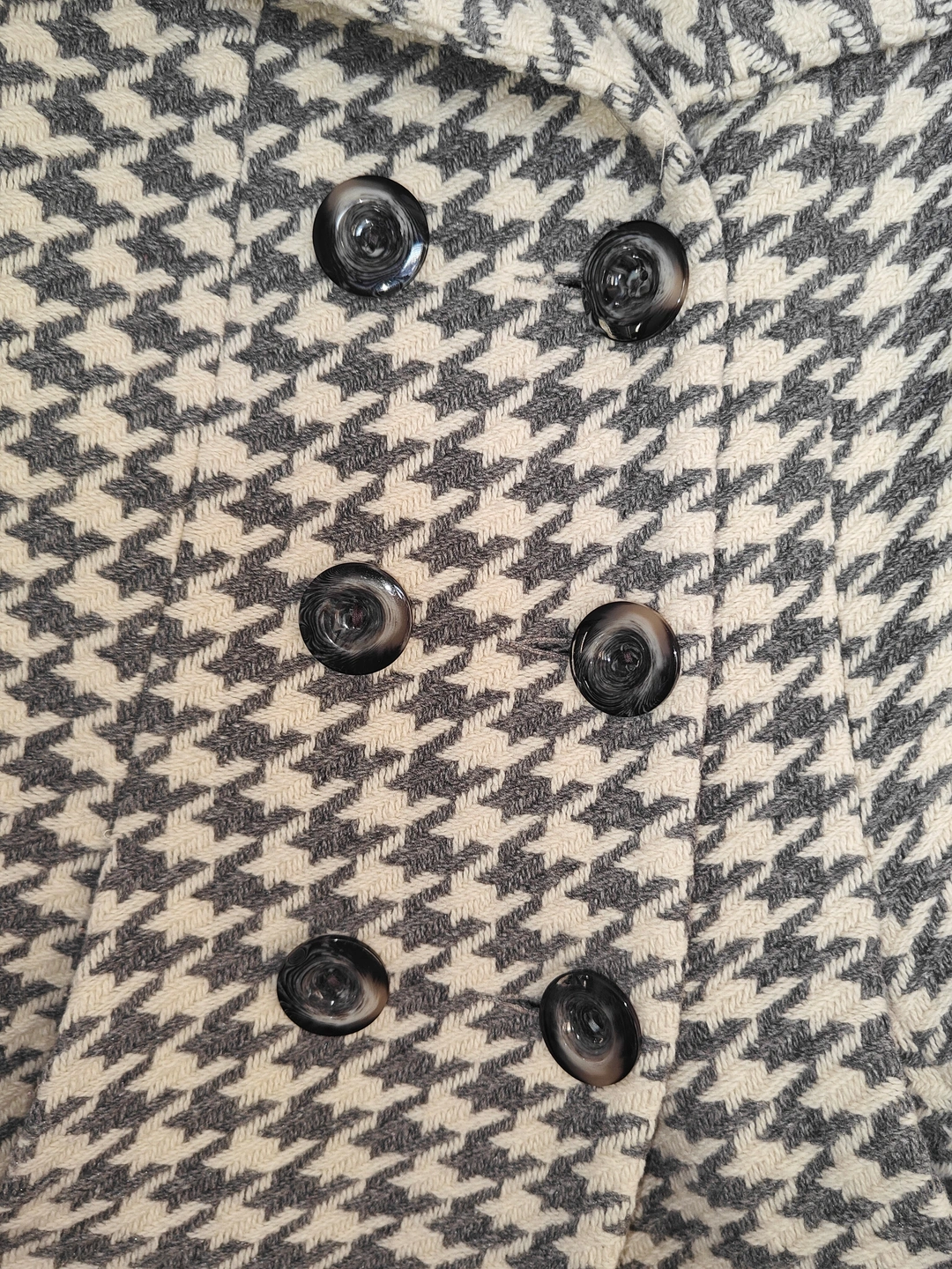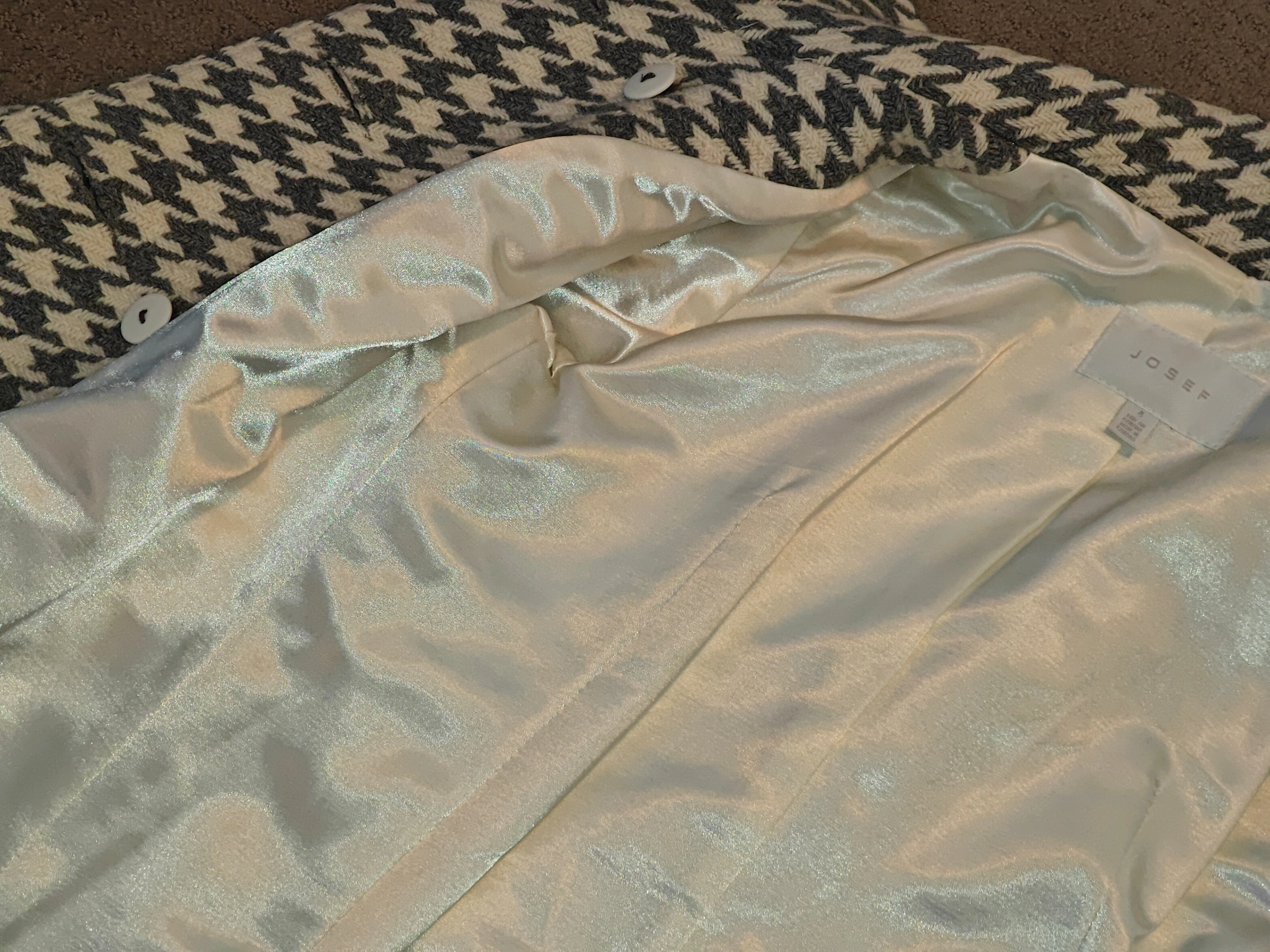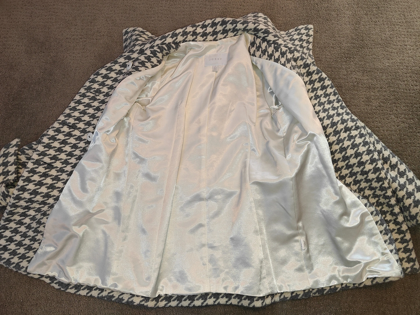 I am selling a JOSEF Wool Houndstooth - Womens Woman Ladies Winter Pea Coat Jacket Front Double Breasted Button in used, excellent condition. No rips, tears, or stains. Only worn a few times. Paid $550. Embrace the colder seasons in timeless style with this elegant peacoat from JOSEF. Made in Canada with exceptional quality and craftsmanship, this jacket is a statement piece that combines classic design with cozy warmth. This striking peacoat features a sophisticated houndstooth pattern in a classic black and white (or dark gray and off-white) colour palette, making it a versatile addition to any wardrobe. The double-breasted front with large, stylish buttons and a broad lapel collar adds a touch of vintage charm, while the slim fit silhouette offers a modern, tailored look. The jacket also comes with a matching belt that can be tied to cinch the waist, creating a flattering shape. Crafted from a substantial 80% wool and 20% polyamide blend, this coat is designed to provide excellent warmth and durability. The interior is fully lined with a smooth blend of 80% polyester and 20% cotton, ensuring comfort and easy wear over any outfit. This jacket has been worn only a few times and is in excellent, used condition. There are no rips, tears, or stains, a testament to its quality and careful use. Originally purchased for $550, this is a fantastic opportunity to own a high-end designer piece at a great price. Details: * Designer: JOSEF * Style: Peacoat / Winter Jacket * Colour: Houndstooth (Black/White or Dark Gray/Off-White) * Condition: Excellent, used a few times. * Made in: Canada * Size: 4 (Slim Fit) * Sleeve (Shoulder to Wrist): 24-1/2" * Shoulder to Shoulder: 15" * Total Length (Bottom Collar to Bottom Edge): 31" * Exterior Material: Wool 80% Polyamide 20% * Interior Material: Polyester 80% Cotton 20% * Style: F098864 Comes from a pet and smoke-free environment. Pickup in Mount Pleasant (NW Calgary)