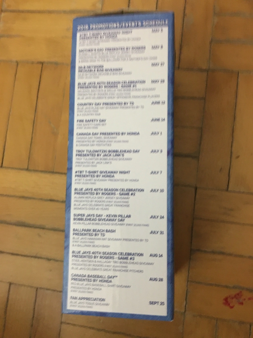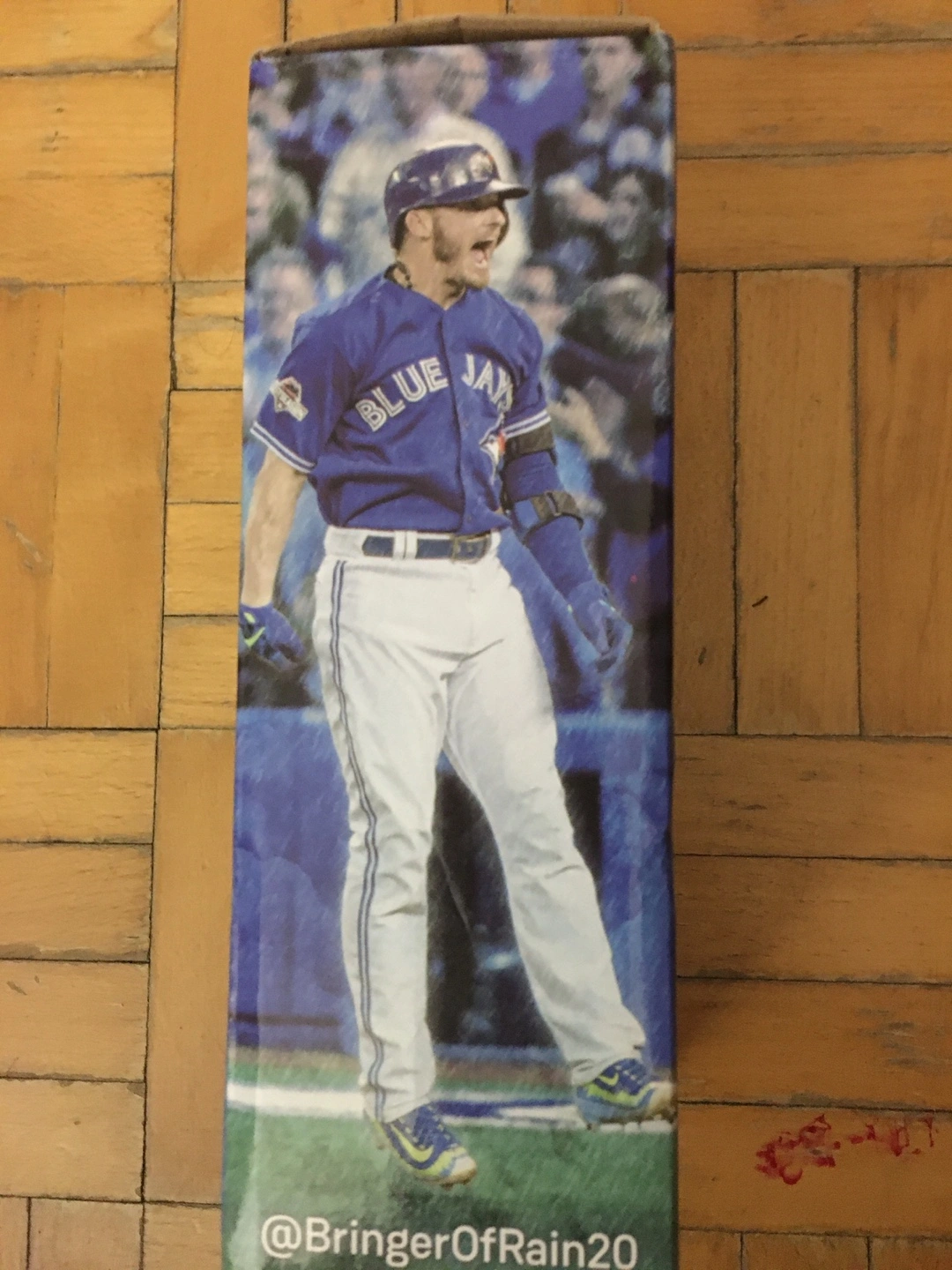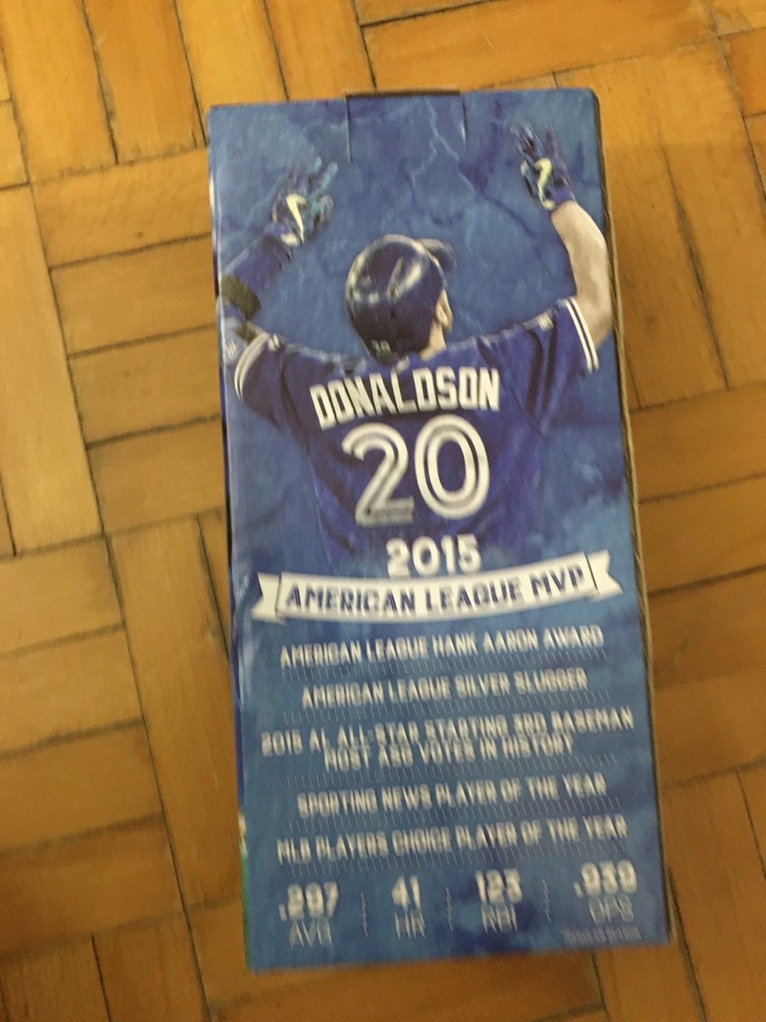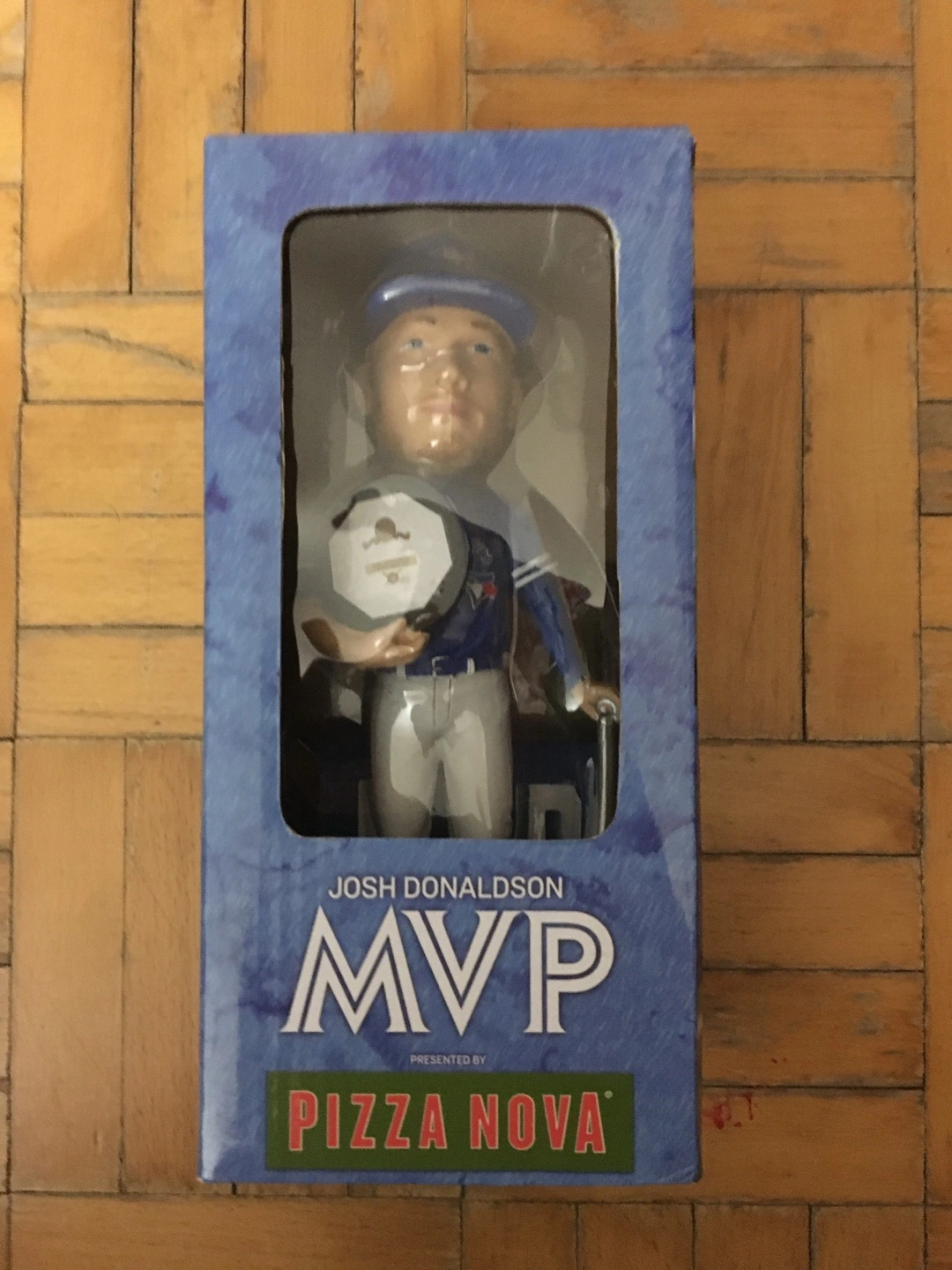 Collectible bobblehead figurine. Features Josh Donaldson in a Blue Jays uniform. Presented by Pizza Nova. Commemorates his 2015 AL MVP season. In original box.new never opened