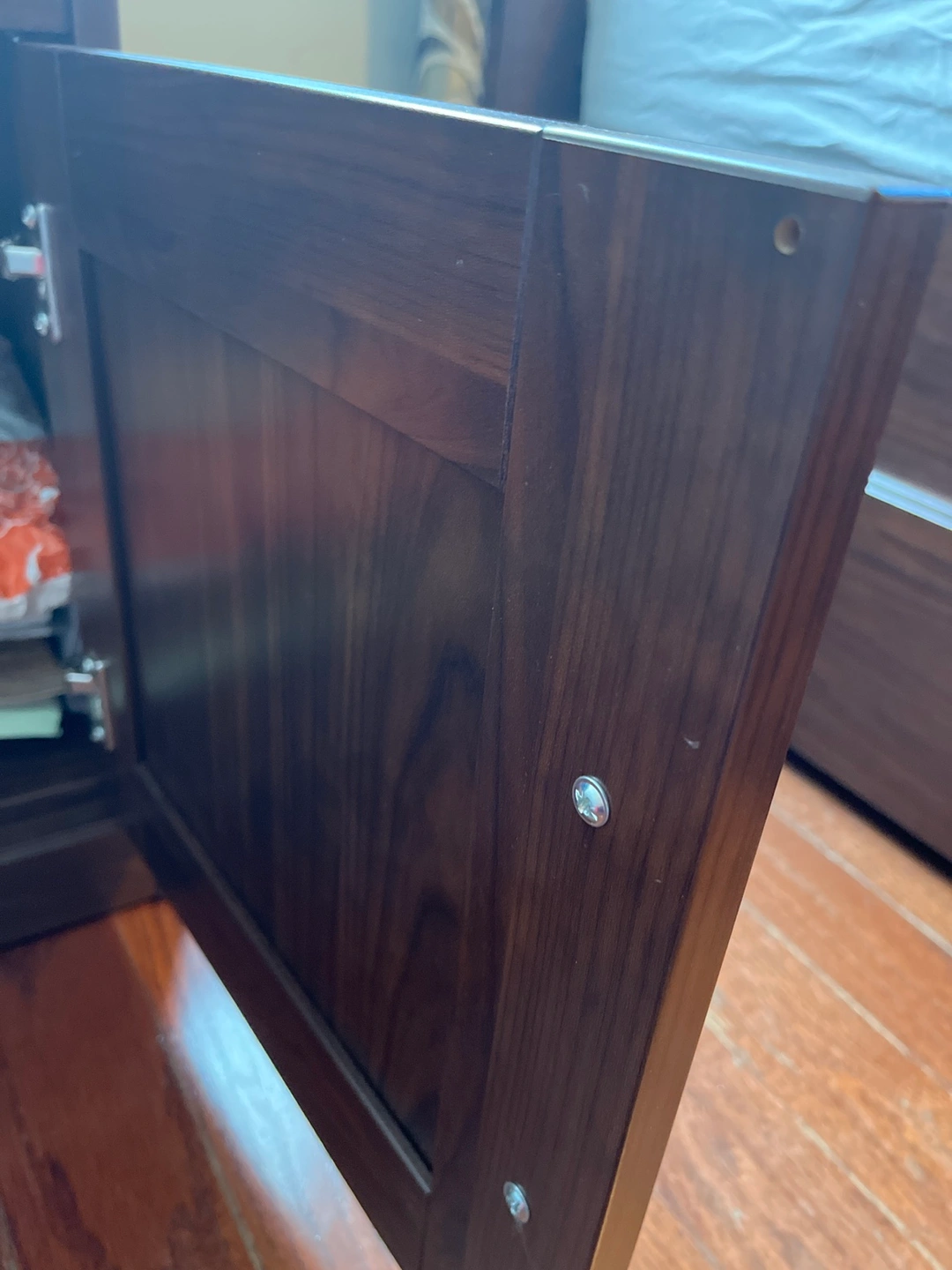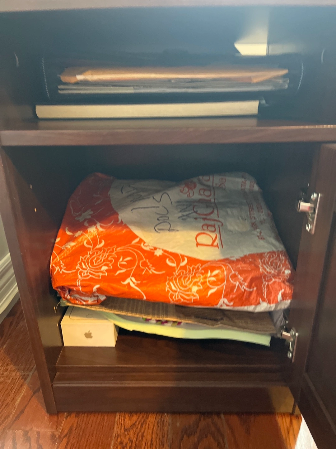 Small wooden cabinet. Dark brown finish. One cabinet door. Small shelf above cabinet. Good for small spaces.