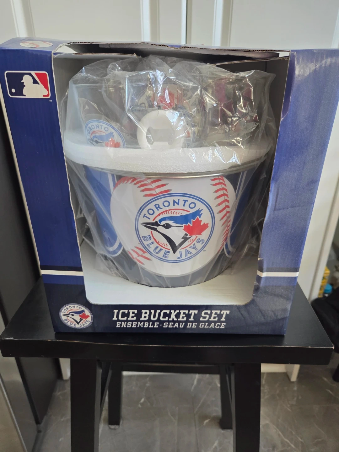 This ice bucket set features the Toronto Blue Jays logo. It includes four 16 oz pub glasses, 12 coasters, and a metal bottle opener. The set comes in its original packaging, making it a great gift for any fan!