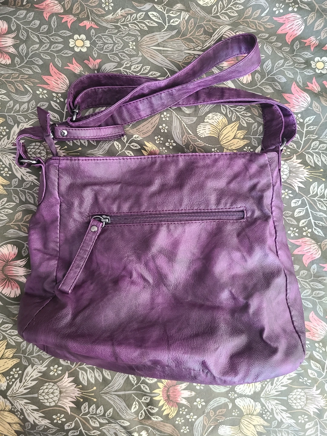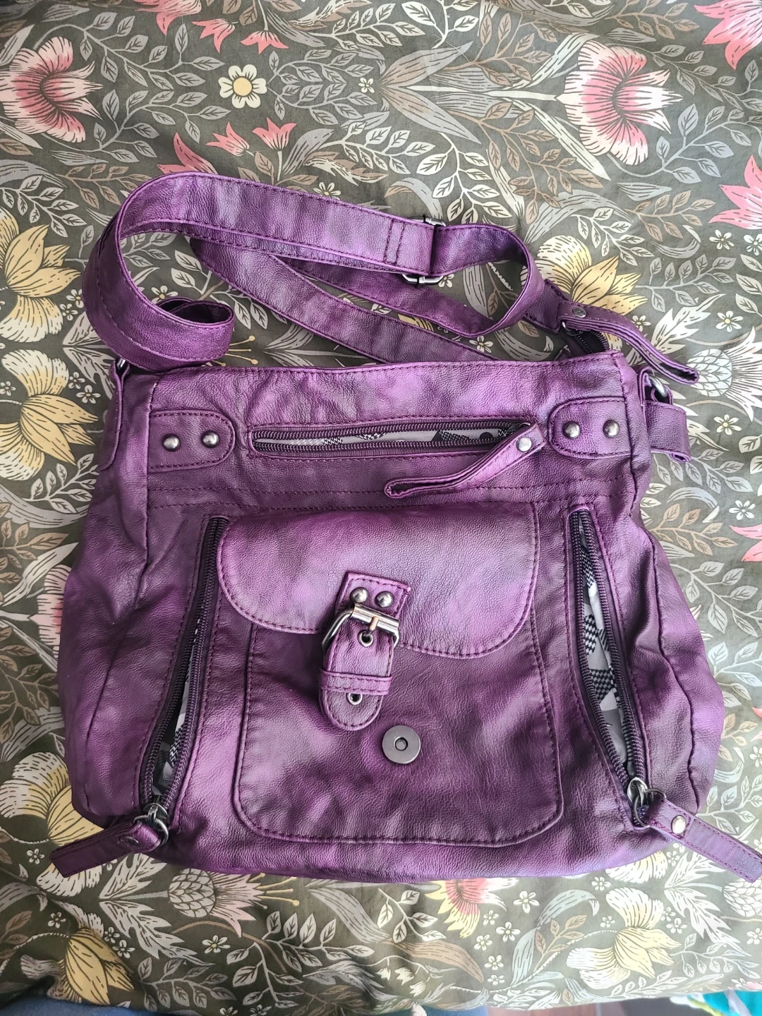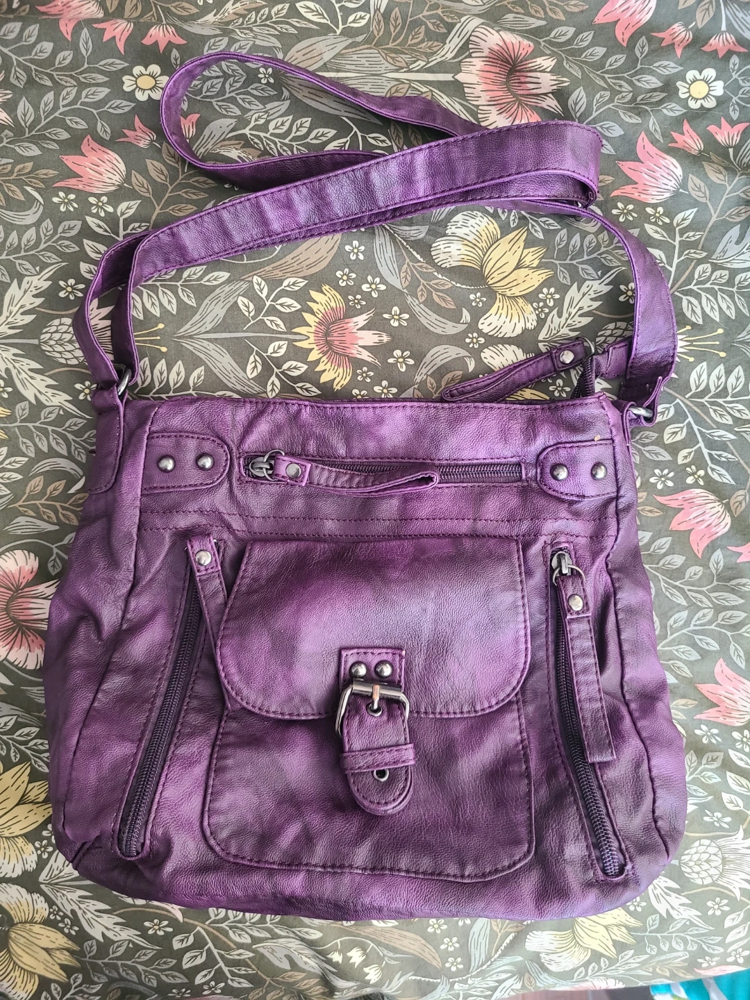 This purple crossbody purse features multiple exterior zippered pockets, 3 interior pockets, and a buckle closure flap pocket. It's made of faux leather with a patterned interior lining. It's perfect for everyday use or a night out!