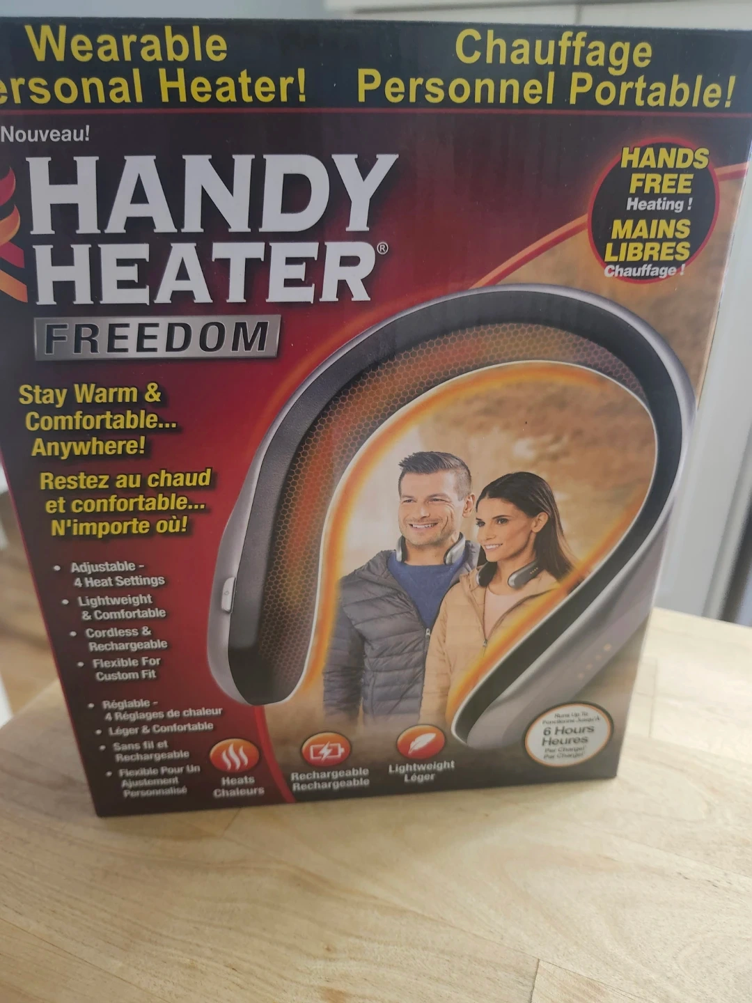 Stay warm and comfortable anywhere with this Handy Heater Freedom wearable personal heater. It's adjustable with 4 heat settings, lightweight, and comfortable to wear. This cord-free and rechargeable device is flexible for a custom fit.