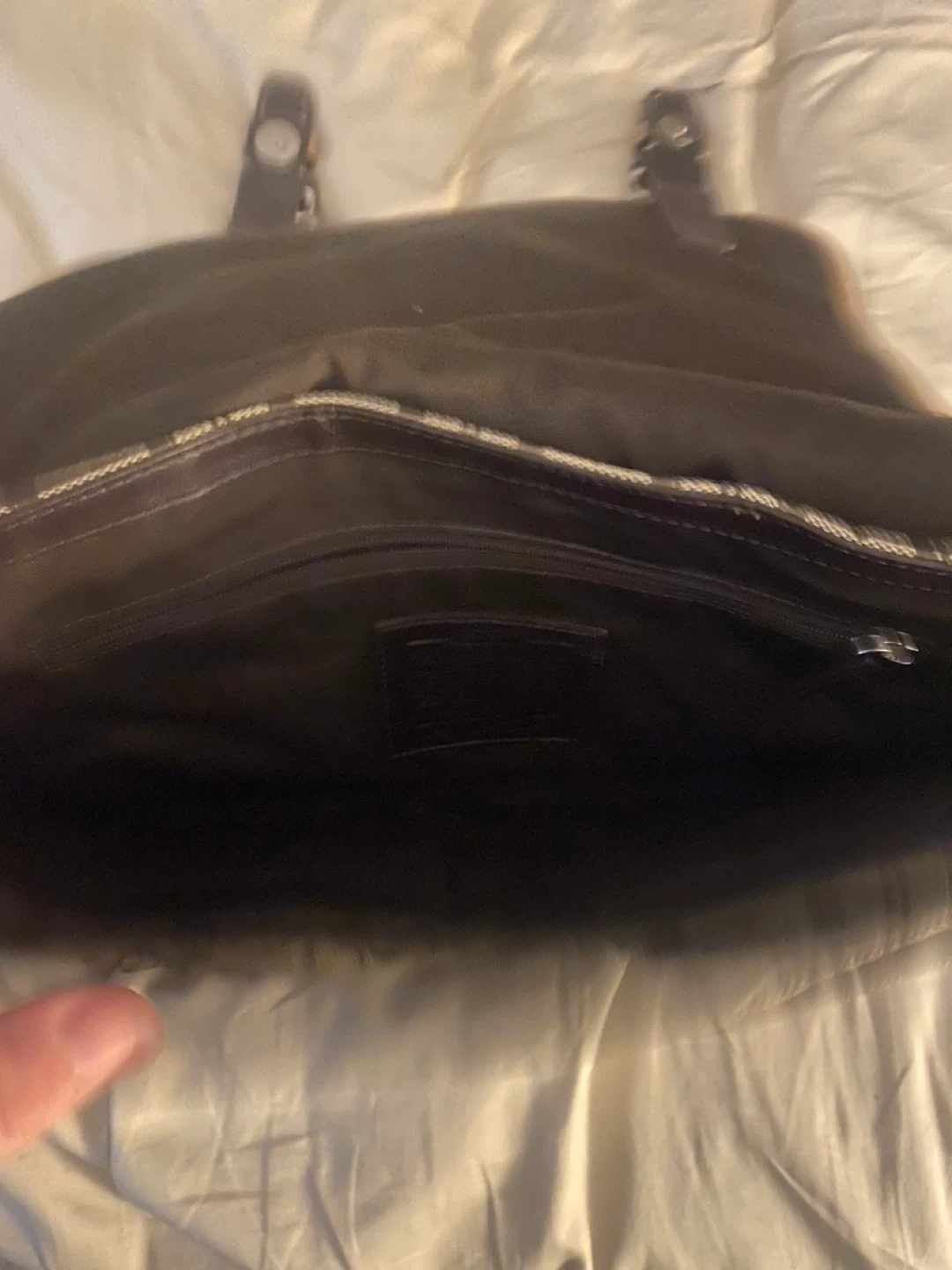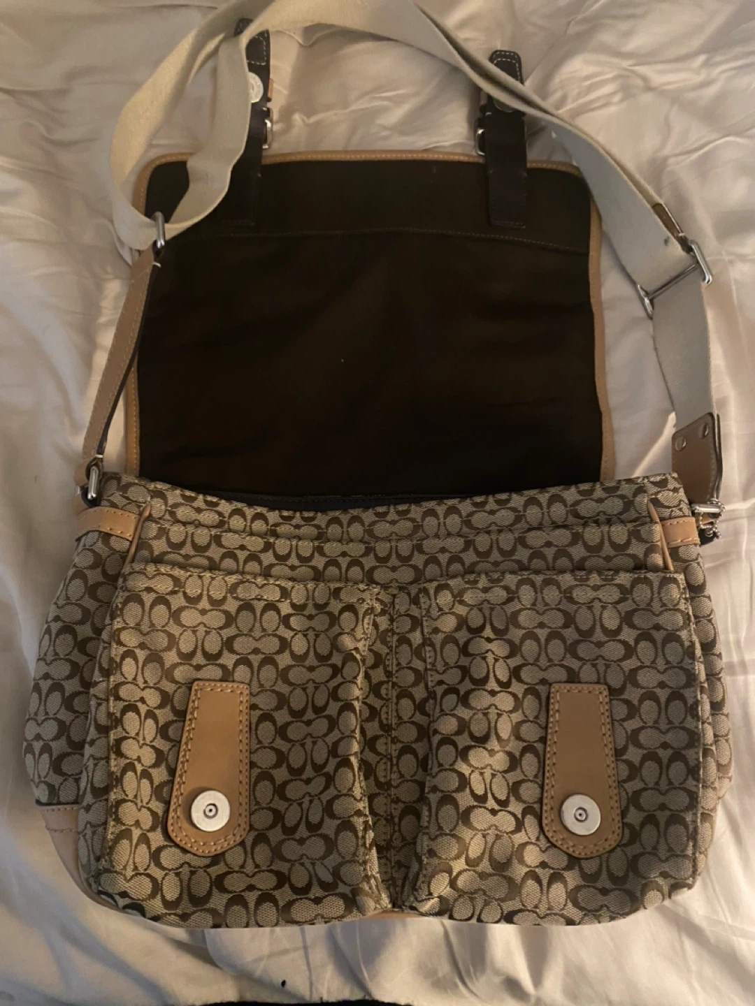 This is a Coach messenger bag in the signature monogram print. It features tan leather trim and silver hardware. The interior has a zippered pocket and the exterior has two flap pockets.