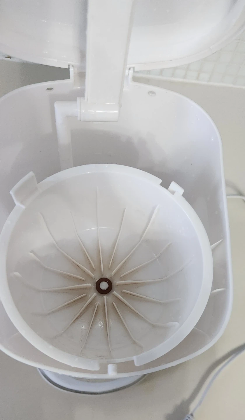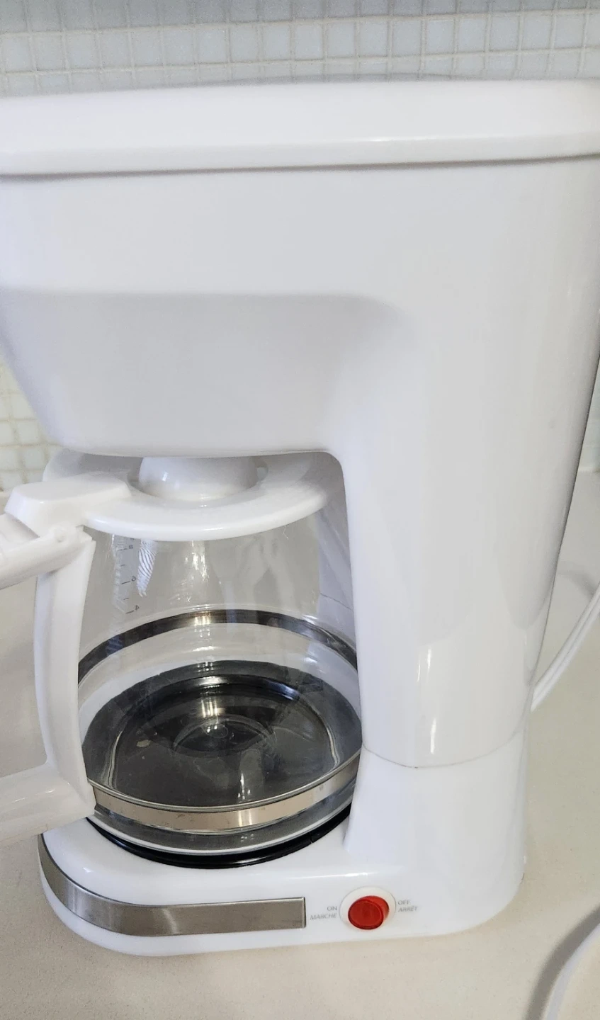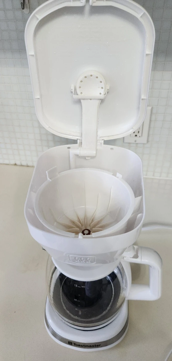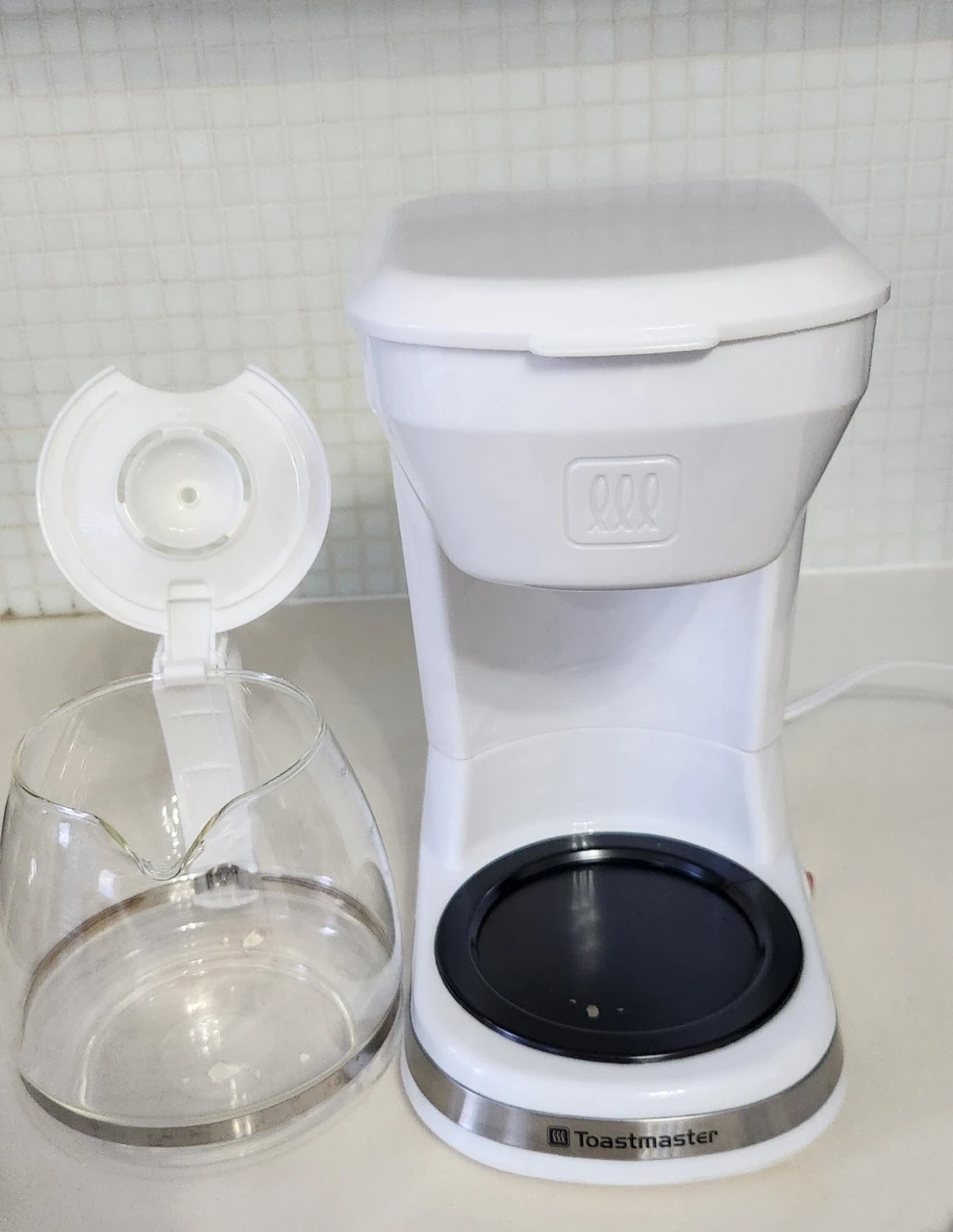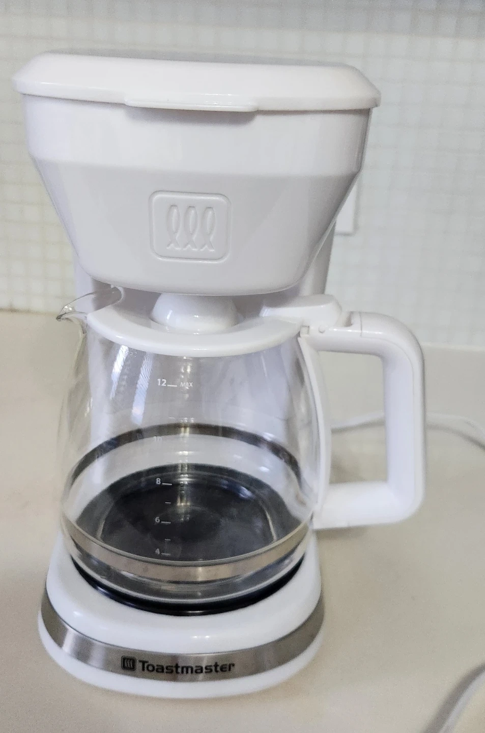 White Toastmaster 12-cup coffee maker that includes filter basket. Easy to use and clean.