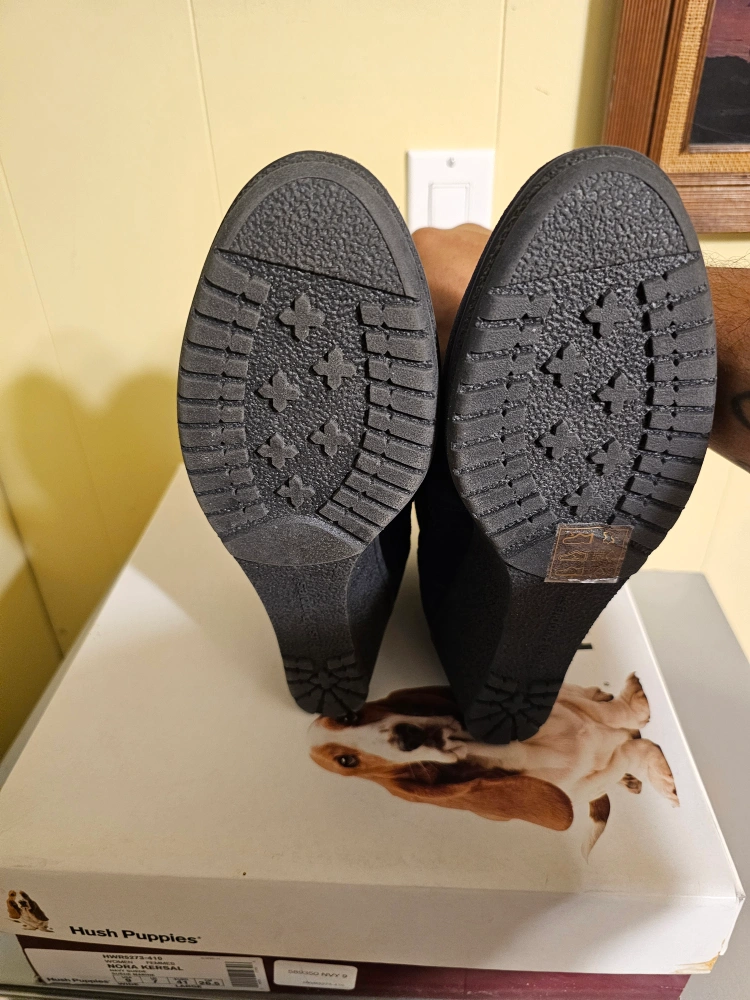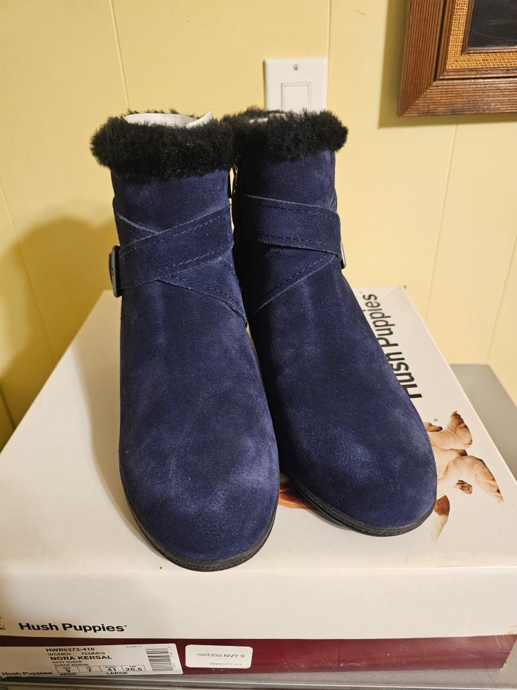 These are Hush Puppies Nora Kersal boots in a beautiful navy suede. They are a women's size 9. They come in the original box!