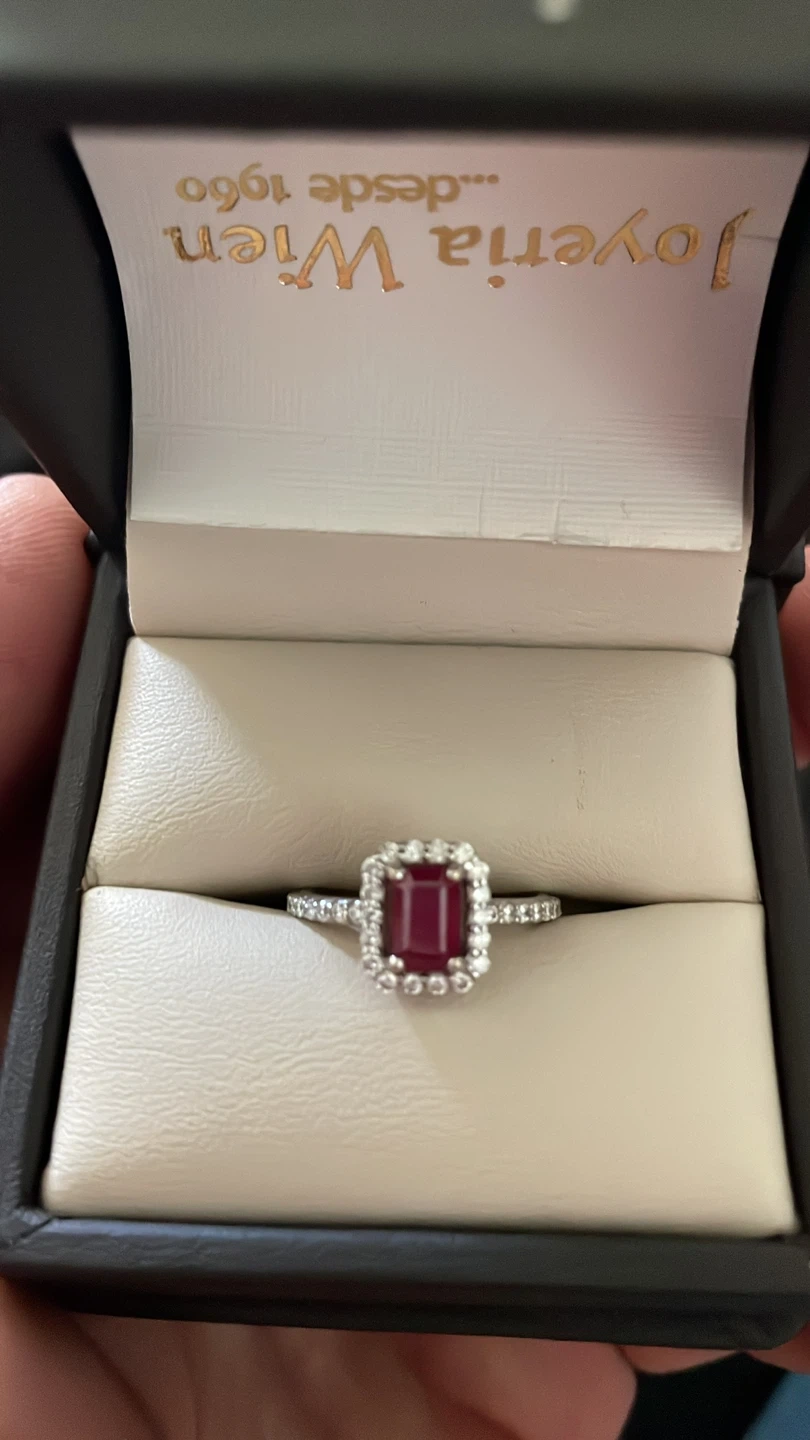 23Selling a beautiful ring from Joyería Wien! It's crafted from 18K white gold and features a stunning ruby surrounded by diamonds. The ring has a classic and elegant design, perfect for any occasion. The diamond is 0.29 and the ruby is 0.83