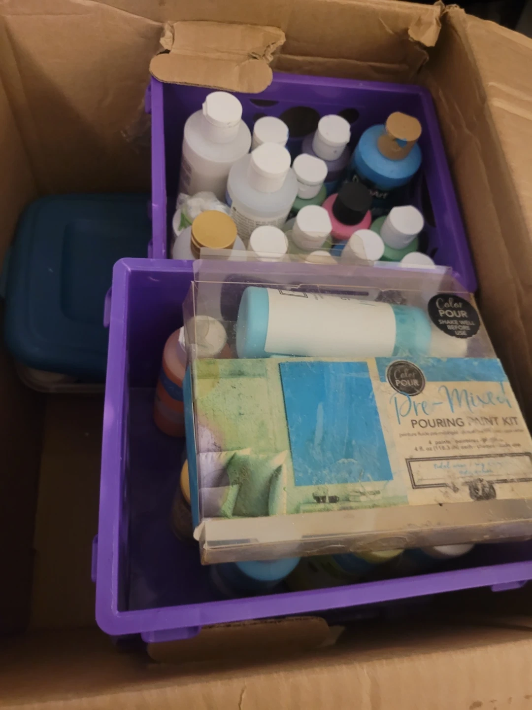 This is a collection of various craft paints and glitters. Includes a pre-mixed pouring paint kit and assorted bottles of acrylic paint and glitter. Various brands and sizes are included. Pick up in Fergus only. Free.
