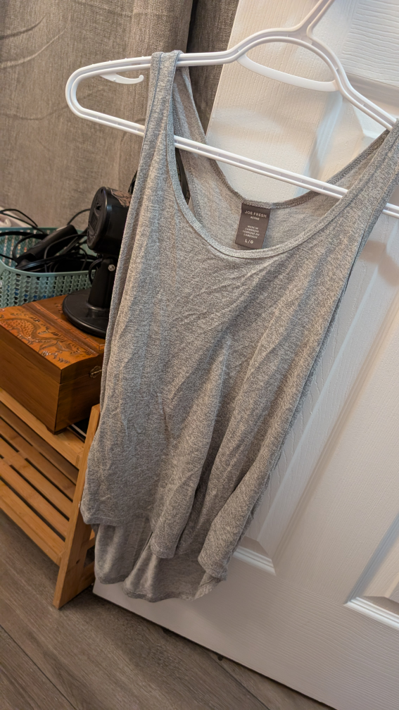Here's a comfy grey tank top from Joe Fresh Active! It's a size L/G. Perfect for workouts or just lounging around the house