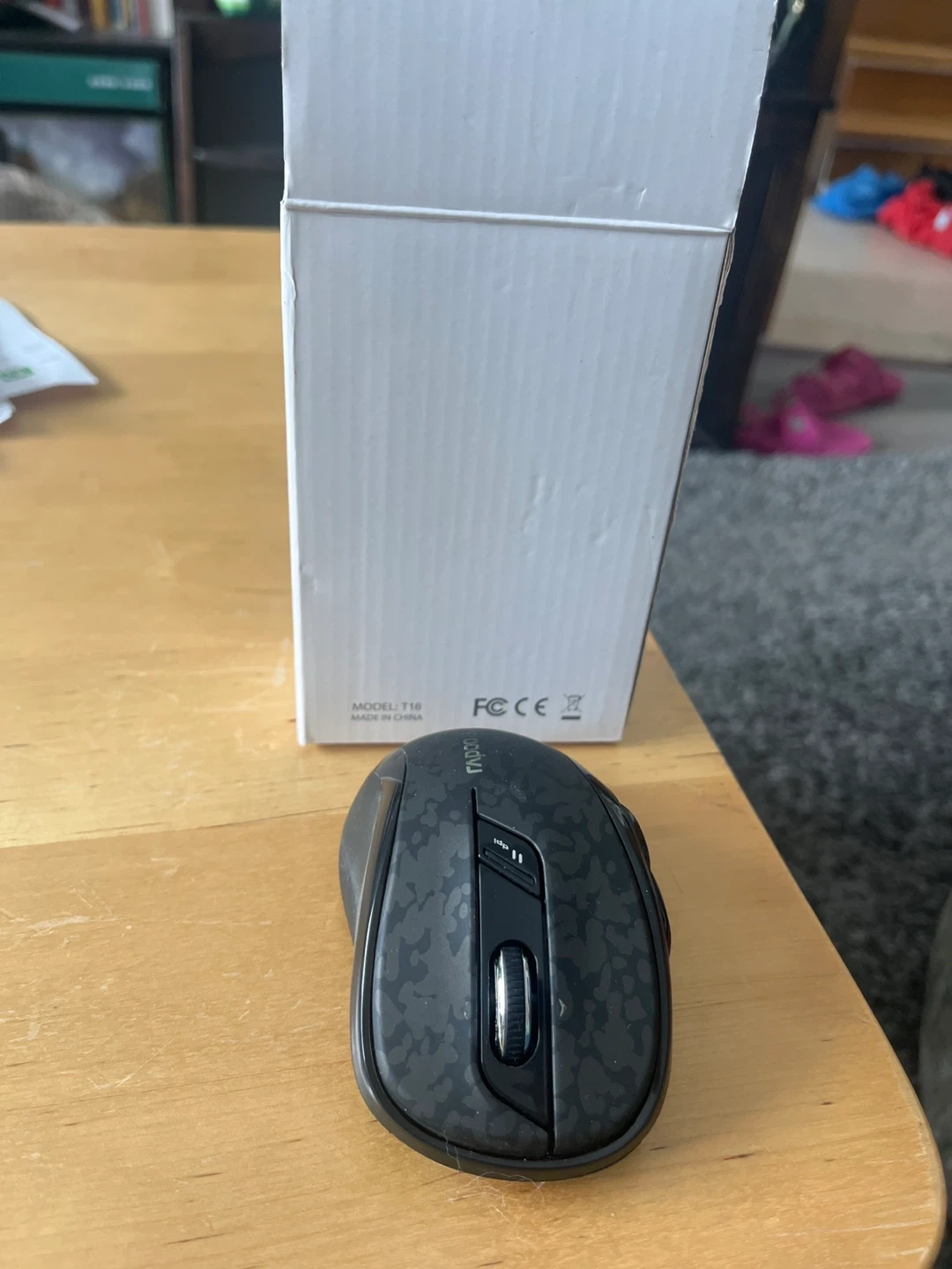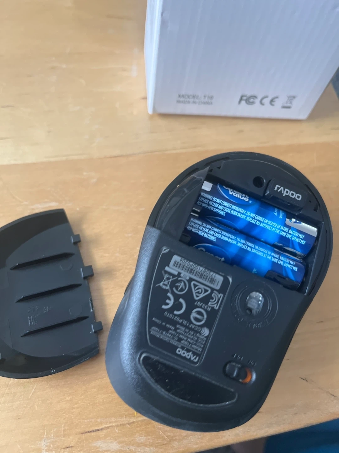 This is a black wireless computer mouse by Rapoo. It uses two AA batteries, which are included. The mouse is model T16.