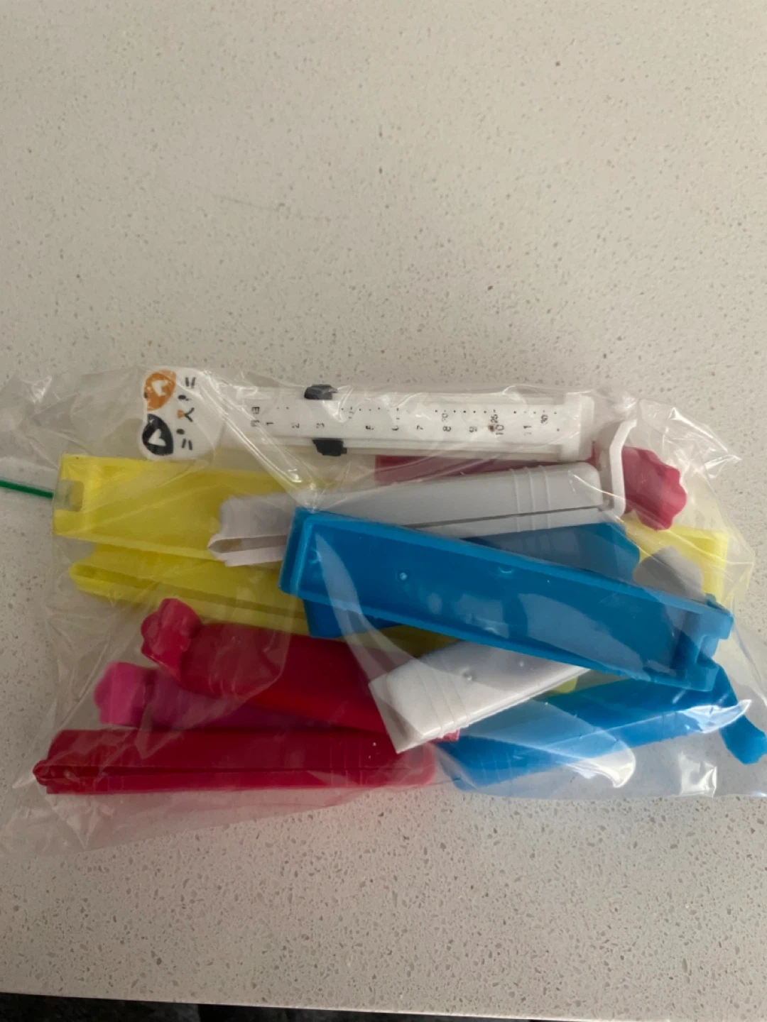 A set of colourful bag clips including red, blue, yellow, and white. They're great for keeping opened bags of snacks or groceries fresh. Includes a white clip with a cute cat design.