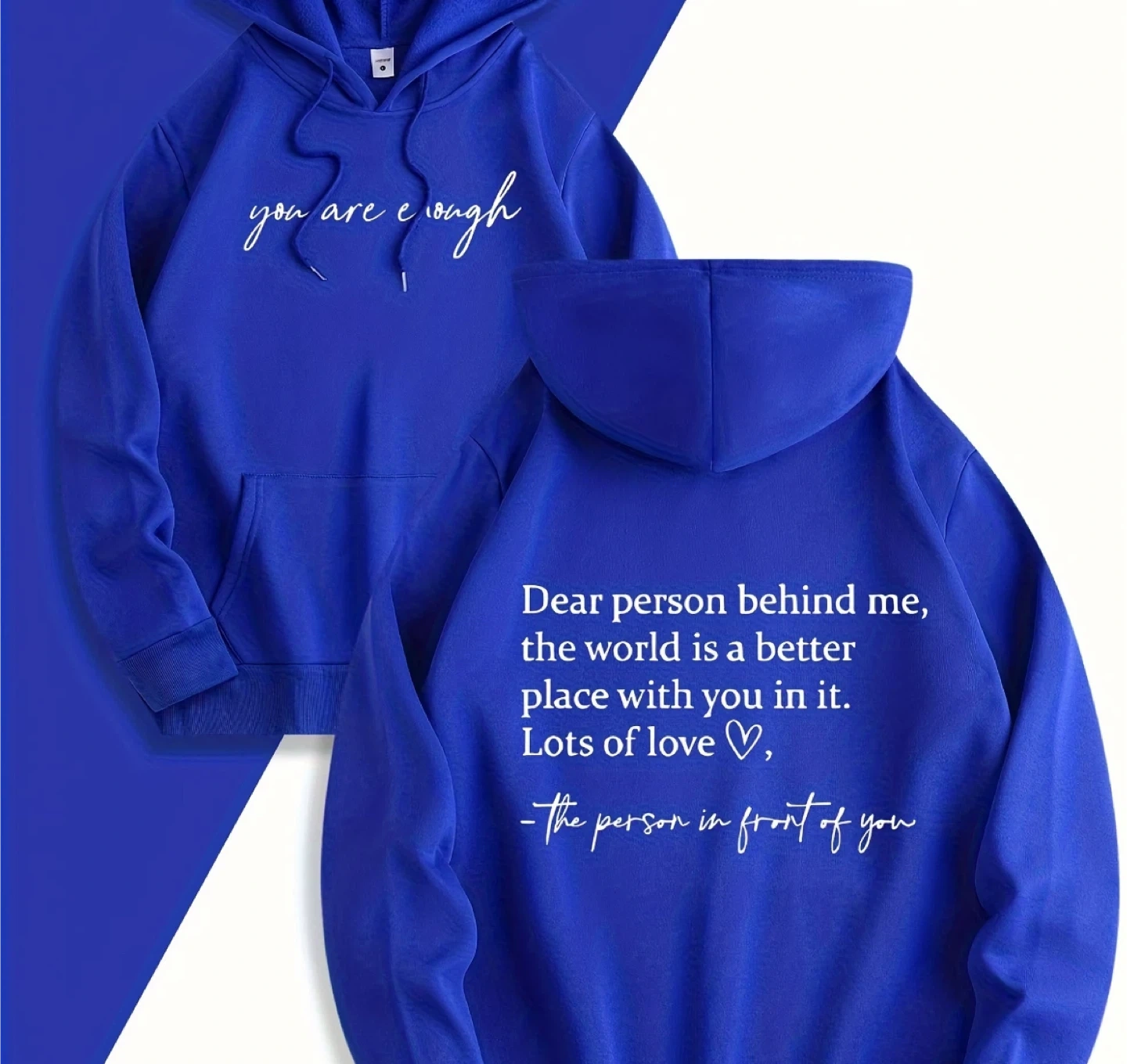 This blue hoodie features a "you are enough" graphic on the front. The back has a "Dear person behind me, the world is a better place with you in it. Lots of love, -The person in front of you" message.