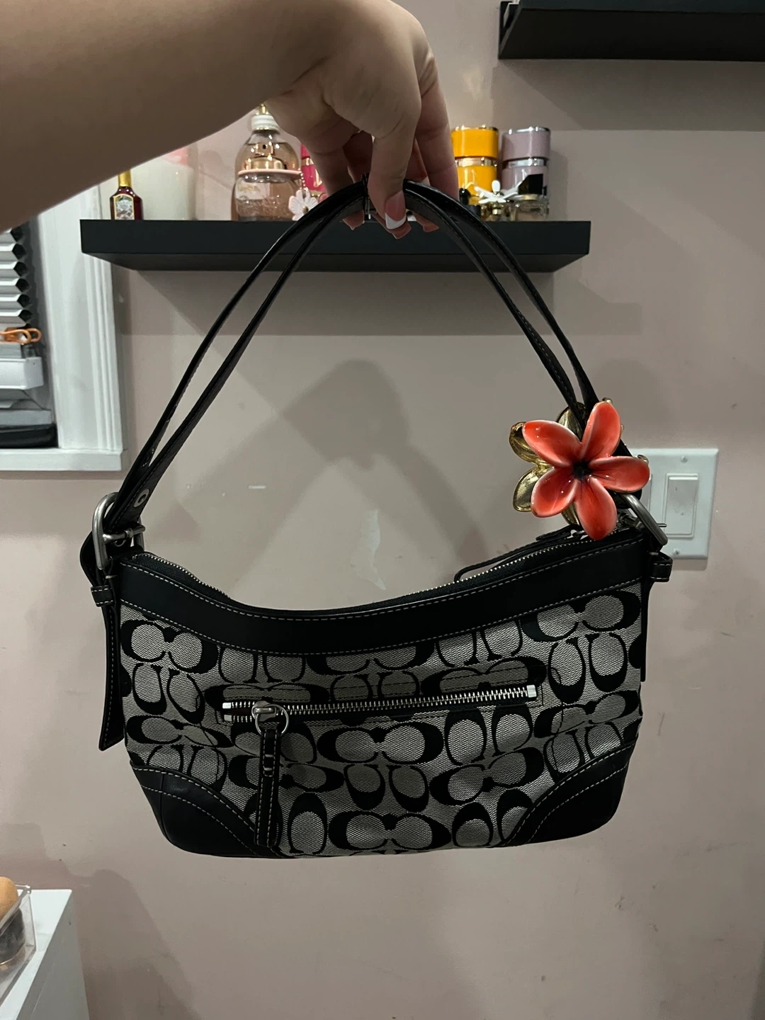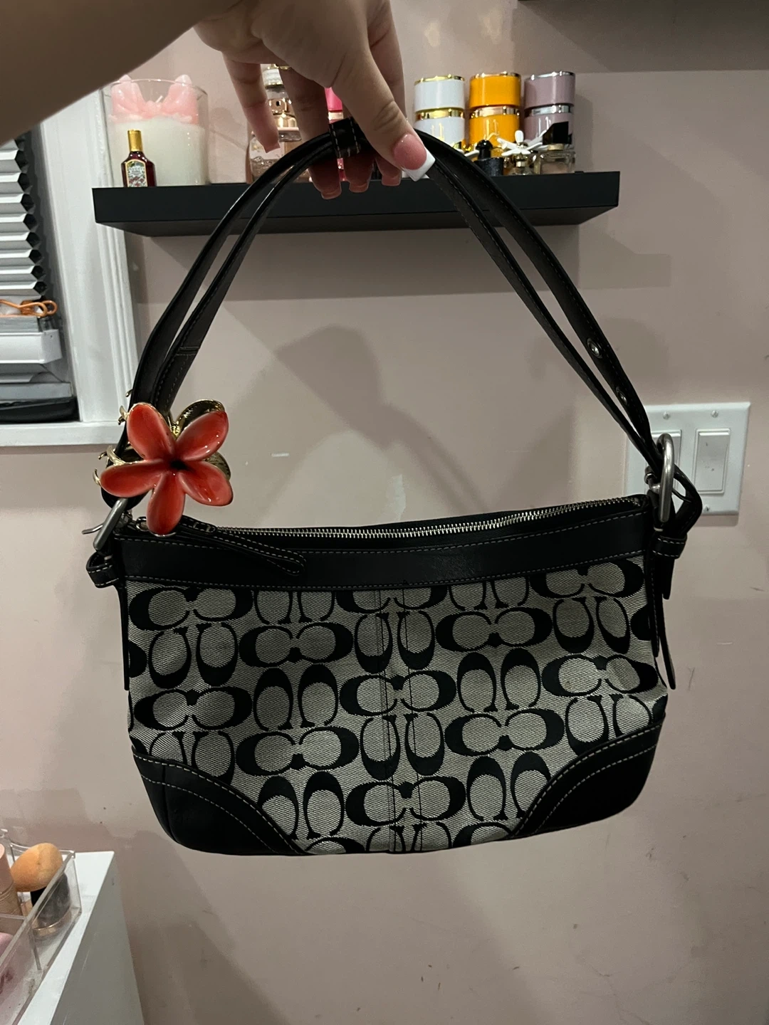 This is a Coach shoulder bag featuring the signature C monogram pattern. It has black leather trim and straps. This bag offers a classic and stylish look for everyday use.