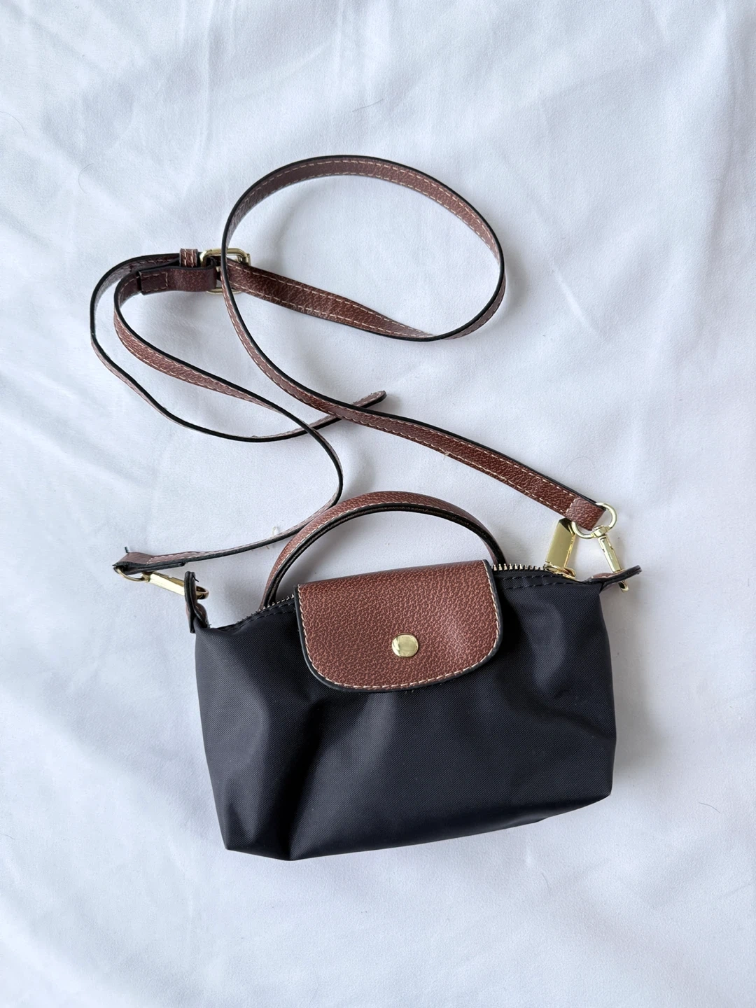 This is a small dupe "Longchamp Le Pliage" bag in black nylon with brown leather trim and strap. It's a versatile shoulder bag that can also be carried by its top handles. The snap closure keeps your essentials secure.