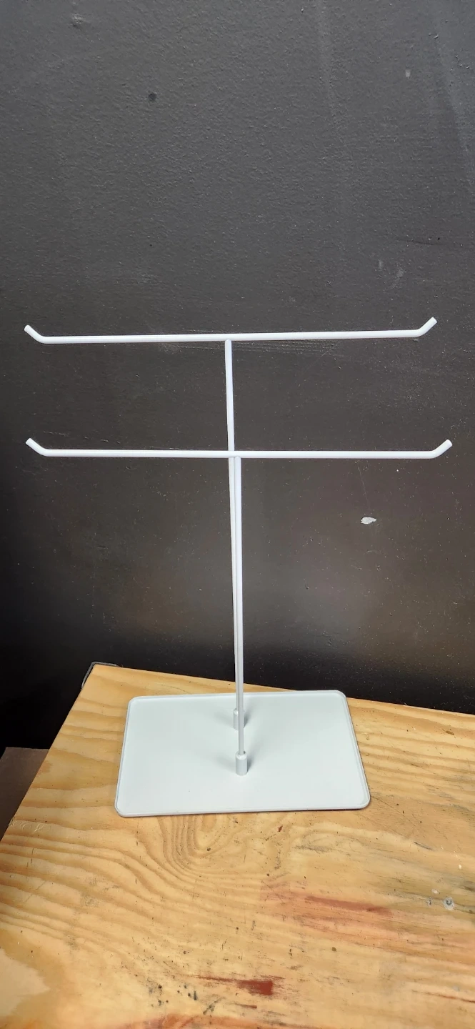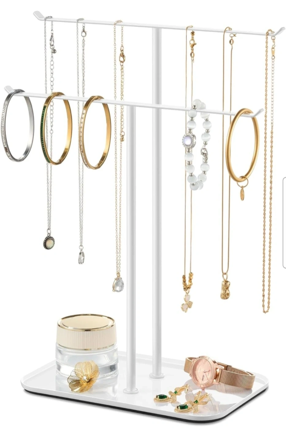 This white metal jewelry organizer stand is perfect for displaying necklaces, bracelets, and earrings. It features multiple tiers for hanging and a base tray for smaller items. Keep your accessories tidy and accessible!
