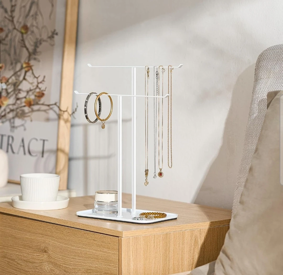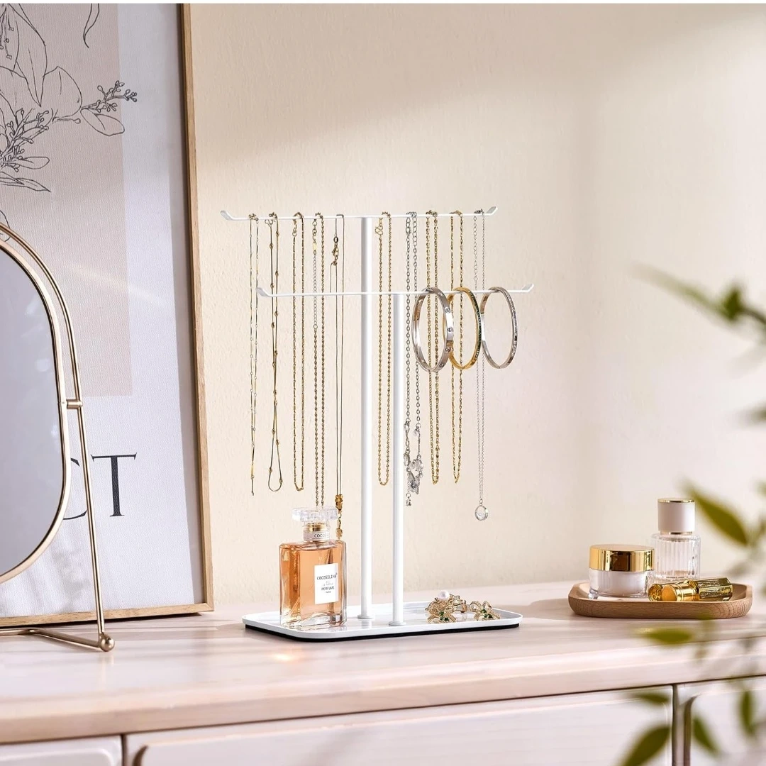 This white metal jewelry organizer stand is perfect for displaying necklaces, bracelets, and earrings. It features multiple tiers for hanging and a base tray for smaller items. Keep your accessories tidy and accessible!