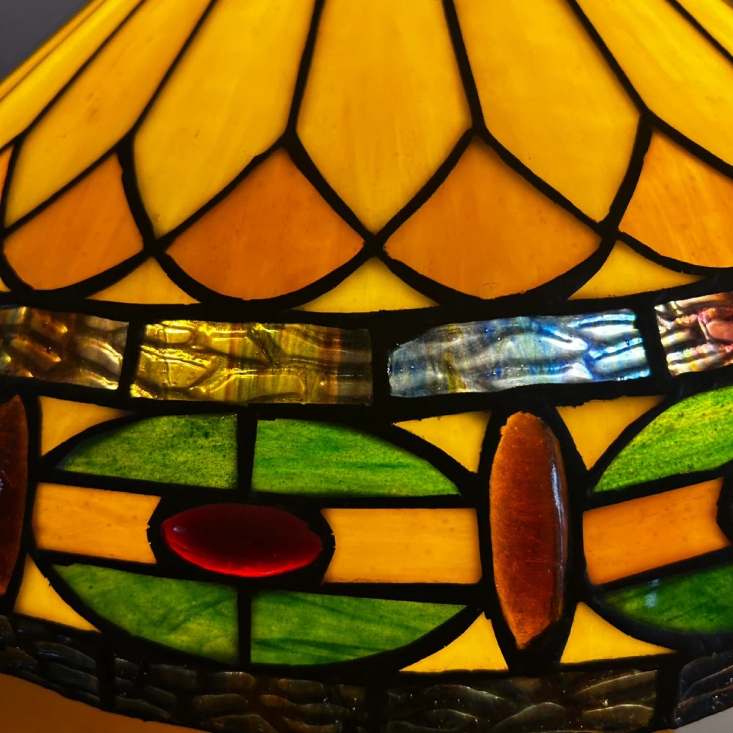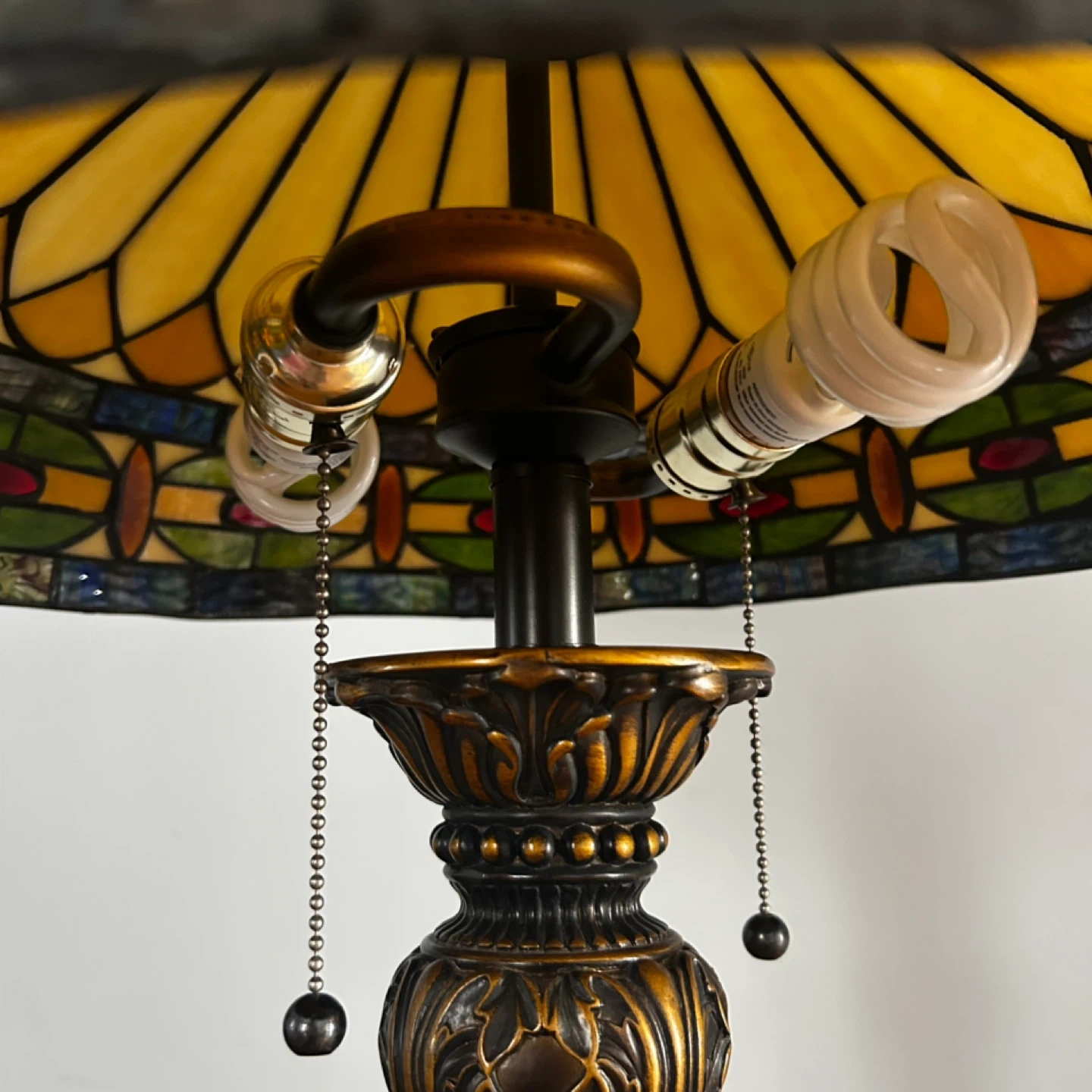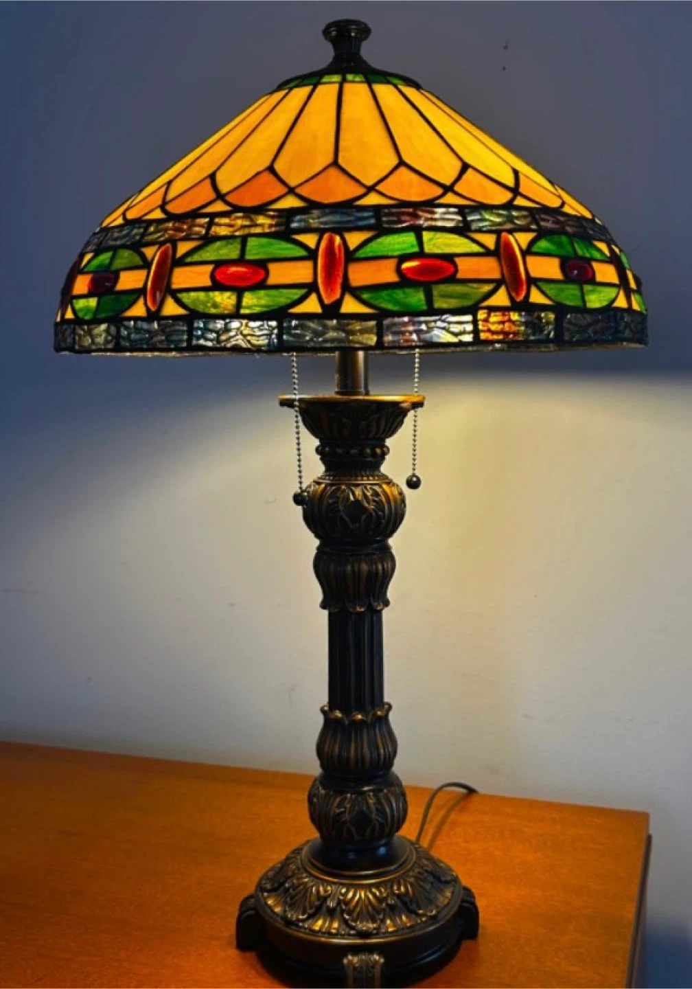 Large Tiffany-style stained glass table lamp with an 18” shade and 28” overall height. Features warm amber glass with green accents and red jewel details. Heavy cast metal base with 2 pull chains - can lite one or both bulbs - Large Tiffany-style stained glass table lamp with an 18” shade and 28” overall height. great condition no damage original shade and cord - pick up south keys