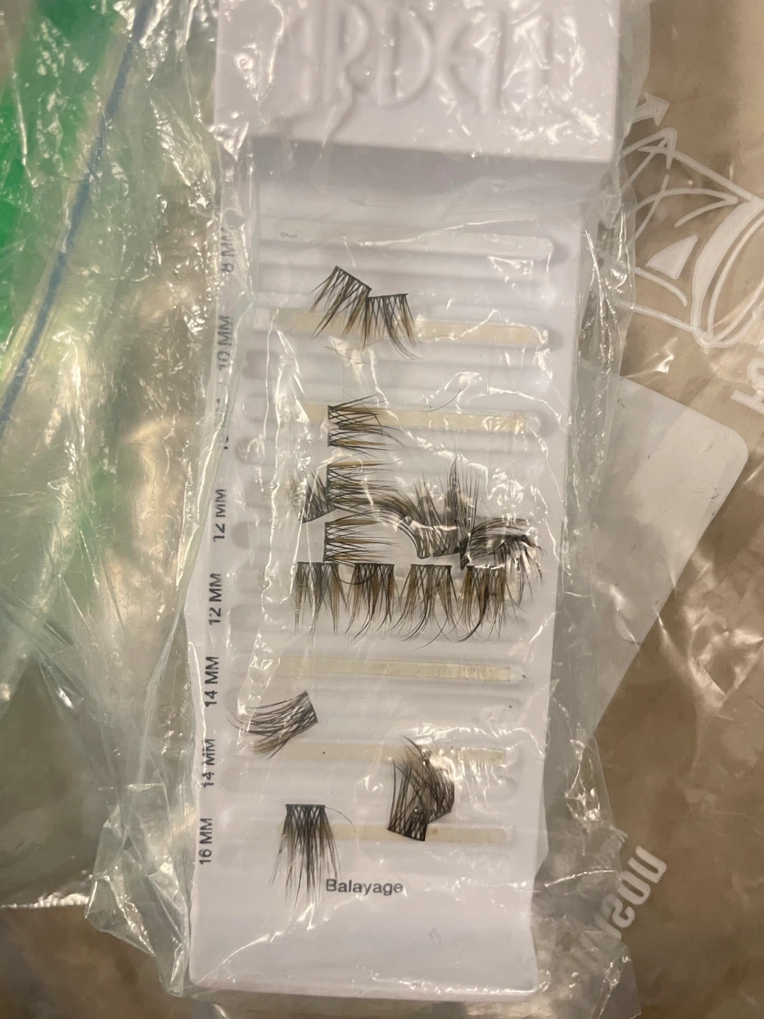 Assorted Ardell Balayage false eyelashes in various lengths, including 8 MM, 10 MM, 12 MM, 14 MM, and 16 MM. These lashes are designed to add volume and length. They're suitable for a dramatic or natural look.