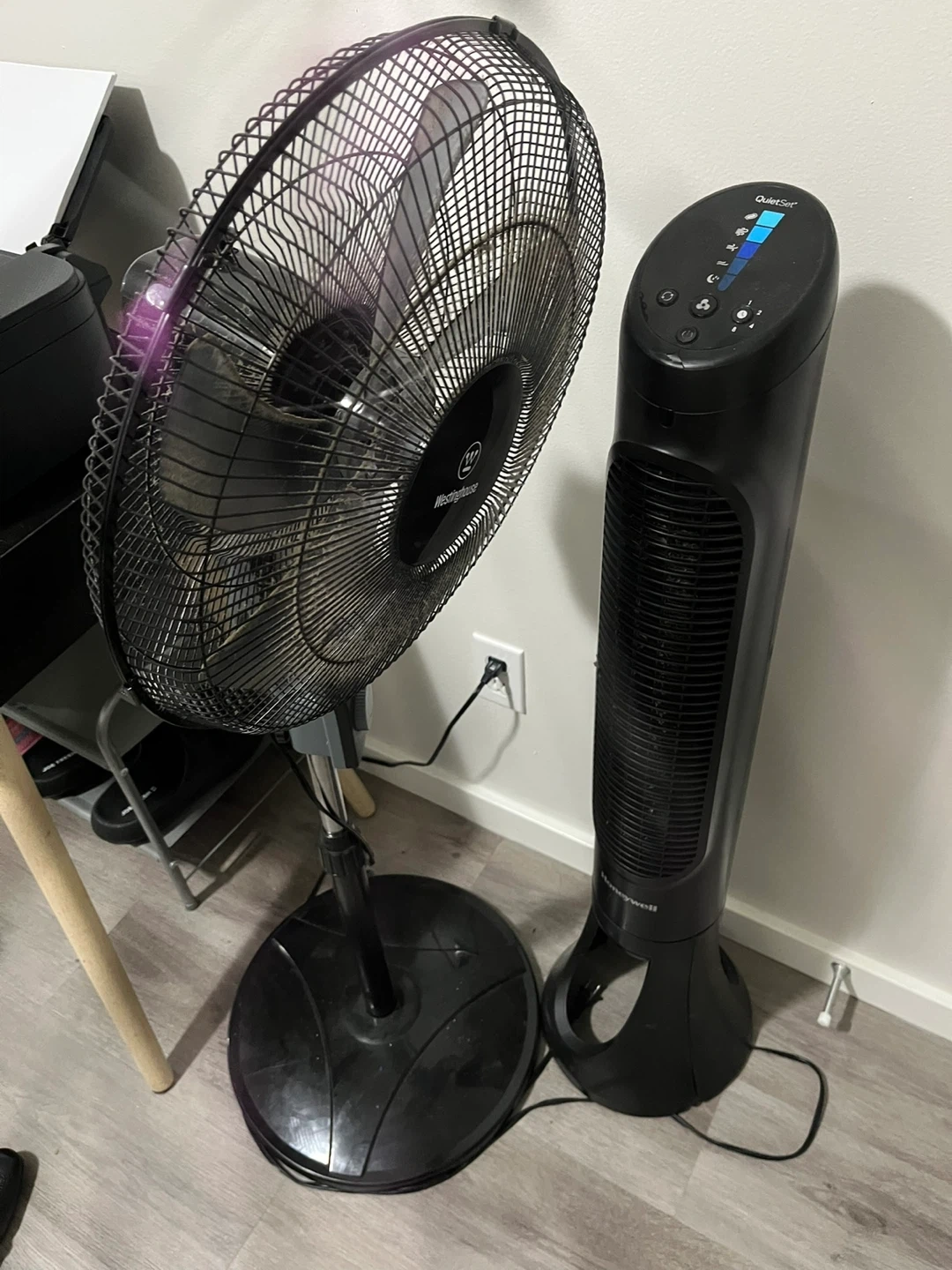 Two black fans for cooling your space. Includes a Westinghouse oscillating stand fan and a Honeywell QuietSet tower fan. Both are black and ready to use.