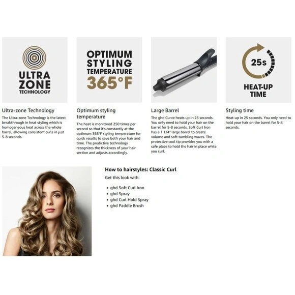 Ultra-zoneTM technology monitors temperature constantly across the whole barrel and adapts to your hair ensuring the optimum styling temperature of 365ºF, for healthier looking hair. Hair type Wavy Shape Barrel Brand ghd Material Ceramic Colour Black Size 12 Count (Pack of 1) Model name Curl Hair Curling Iron Essentials Duo Item weight 0.9 Pounds Power source Corded Electric