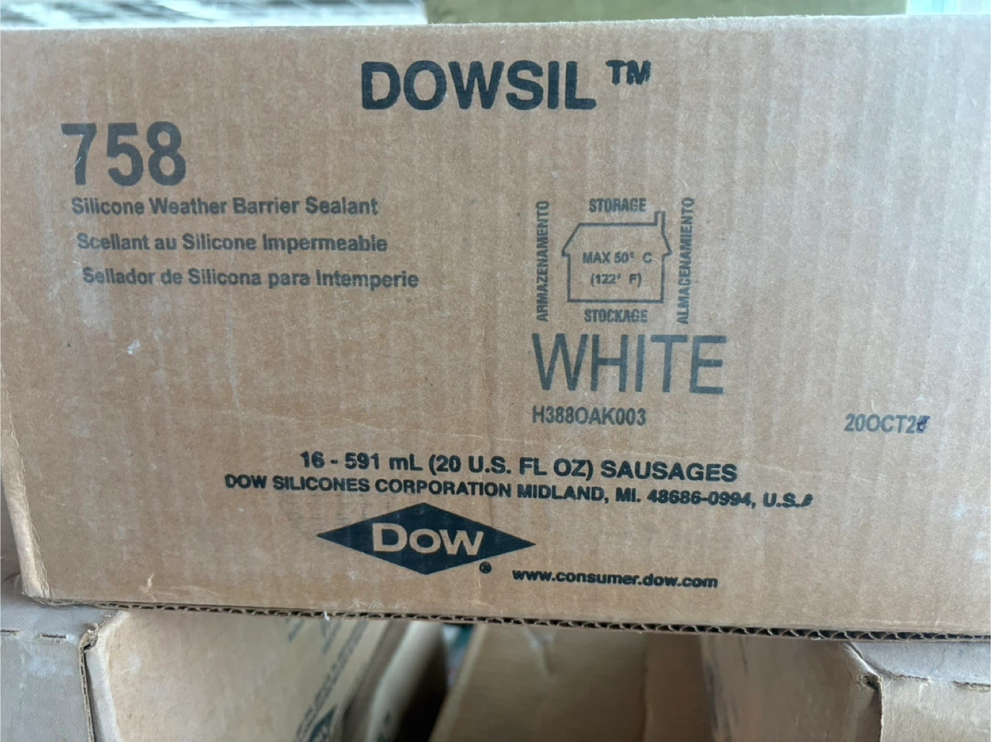 This is a box of DOWSIL 758 Silicone Weather Barrier Sealant. It's white in colour and comes in 16 - 591 ml (20 U.S. FL OZ) sausages. Maximum storage temperature is 50° C (122° F).