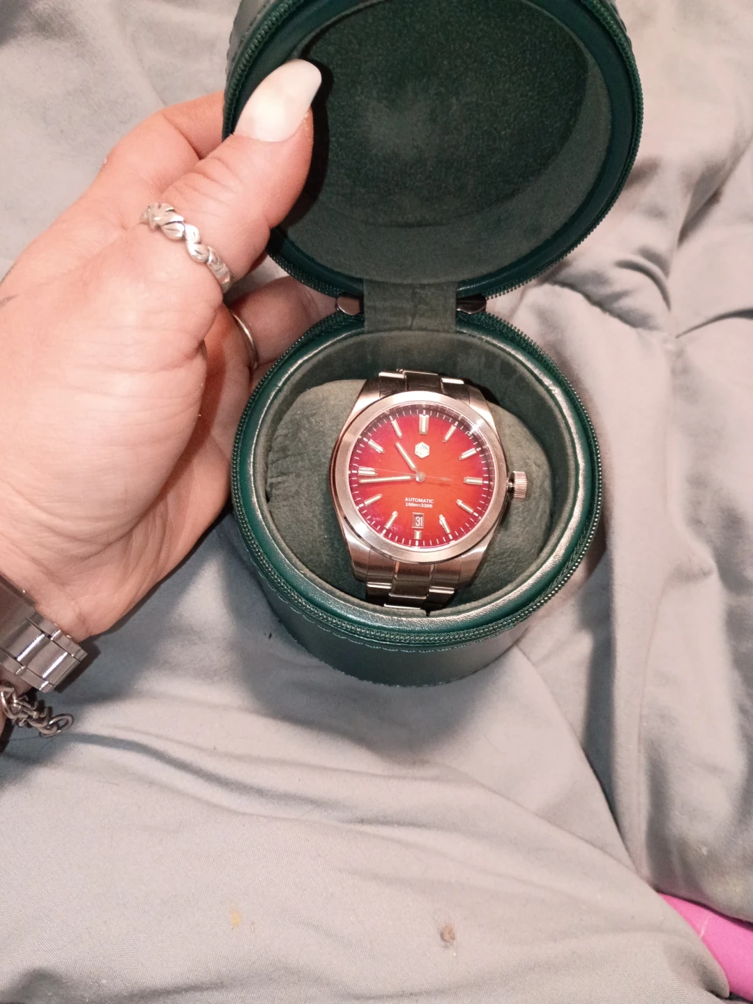 This is a San Martin automatic watch in a green case. It's a nice timepiece for everyday wear. The watch has a red dial and a metal band. Retail for 650