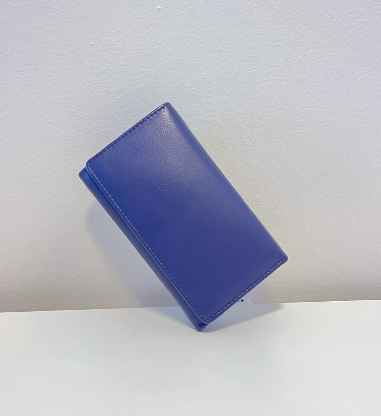 This blue wallet is made from genuine leather. It has multiple card slots and a clear ID window. A snap closure keeps everything secure.