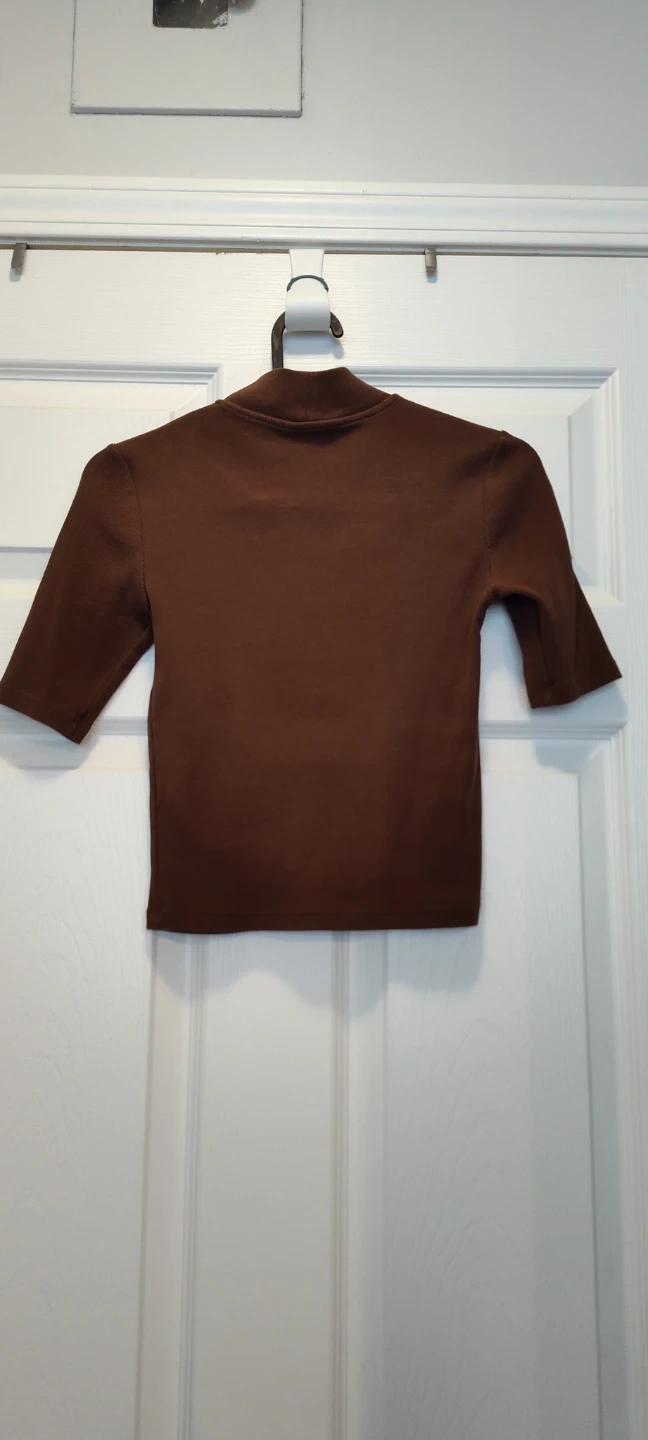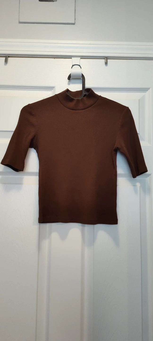A brown top with a mock neck and 3/4 length sleeves. It's a comfortable piece for layering or wearing on its own. The material appears to be a ribbed knit blend.